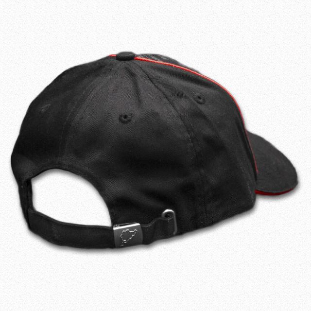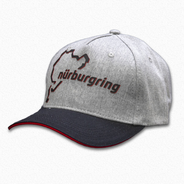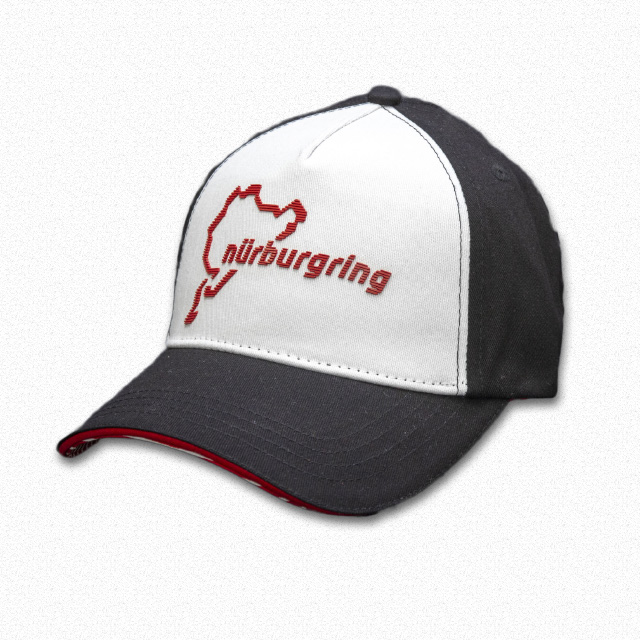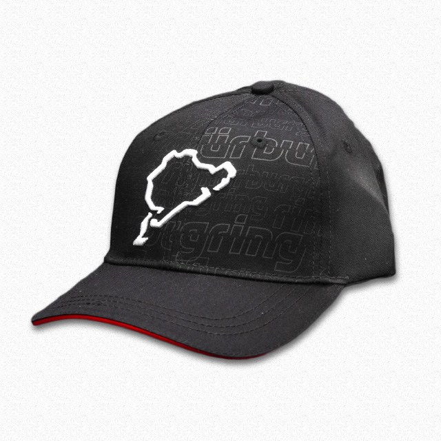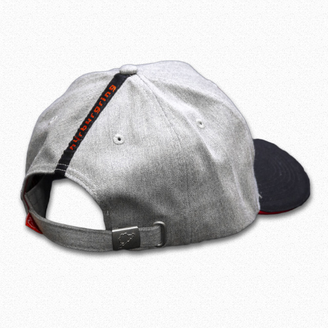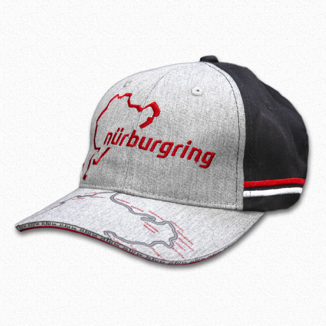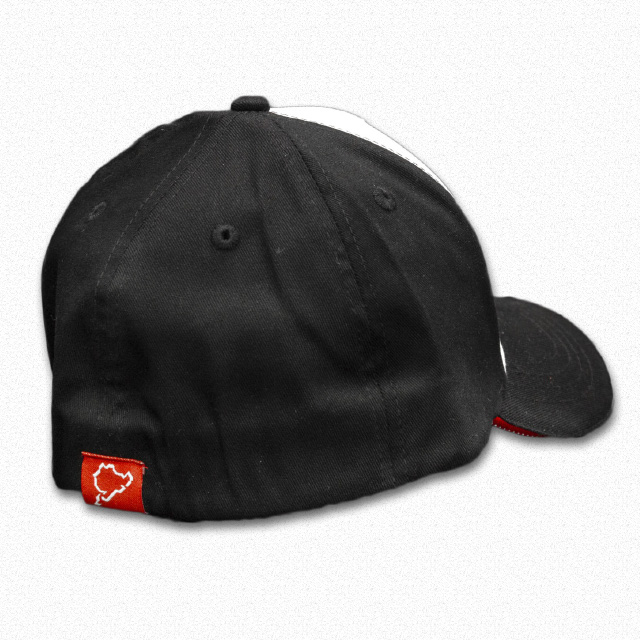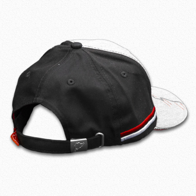 新登場の6パネルキャップです。キャップ外周にはレッドとホワイトの刺繍のラインが施されています。ツバの上面にはニュルのカーブ名を示すシルエットが、先端にはニュルの全長「20.832km」の文字がプリントされているという細部までこだわった仕上がりです。