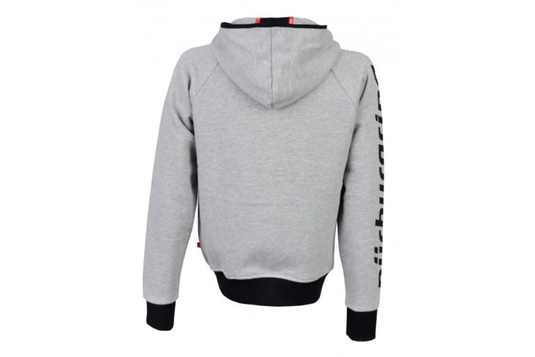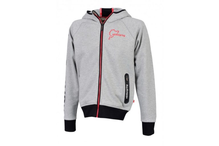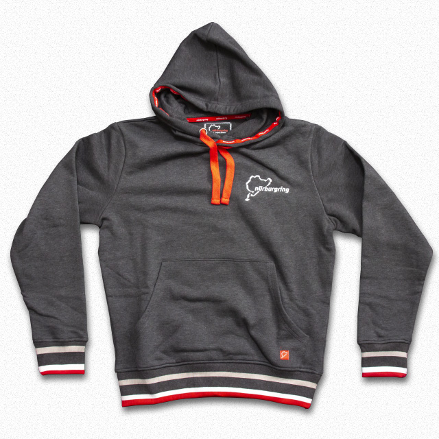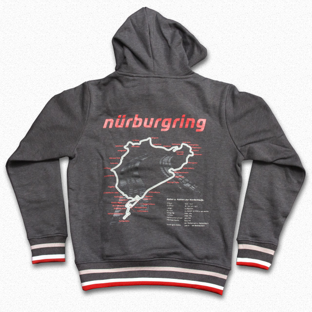 胸元にノルドシュライフェのプリントロゴの入った裏地に起毛のついたリブ付きパーカー。袖部分にNurburgringの文字がプリント。