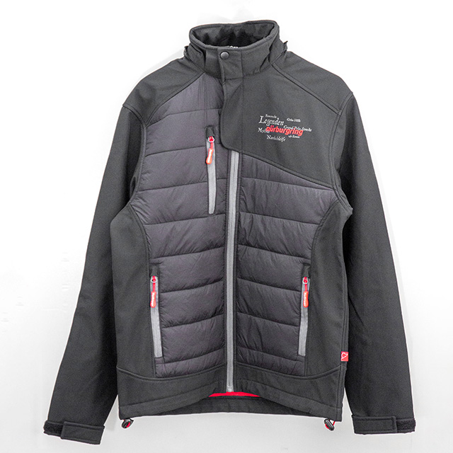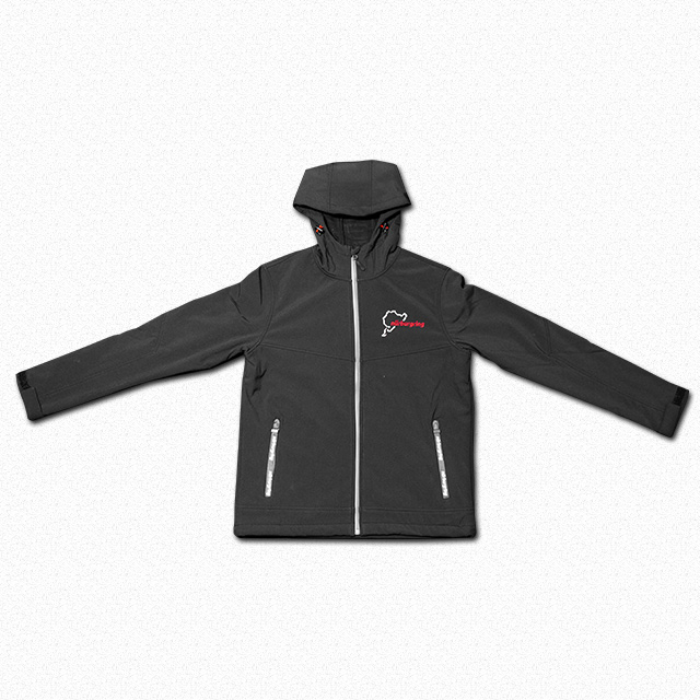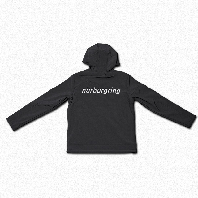 ニュルブルクリンクファンコレクション2018のメンズソフトシェルジャケットです。フードが付いていて防風性、保温性、吸湿性、撥水性に優れています。左胸には小さなニュルブルクリンクのモチーフが入っています。ファスナー部にもロゴがあしらわれており、細部までニュルのこだわりが詰まっています。