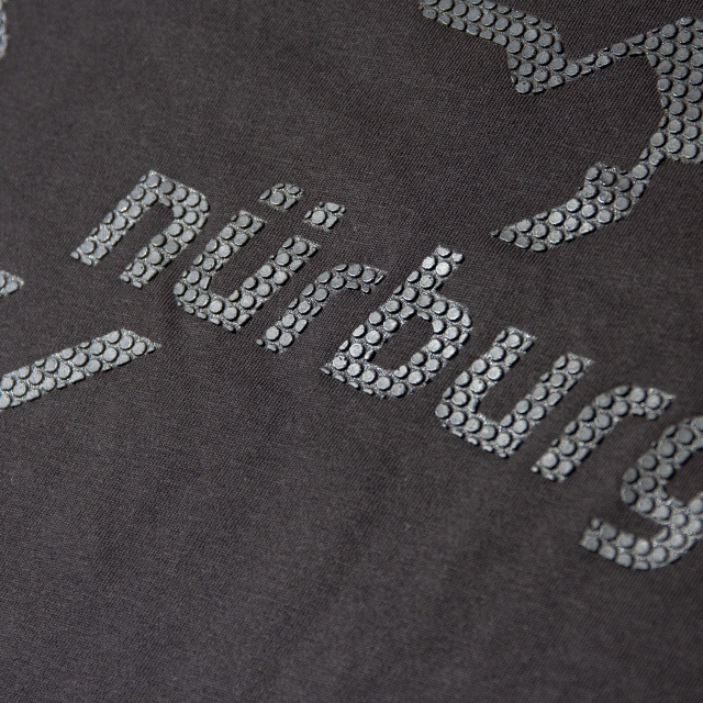 グレーのロゴがドットで大きくプリントされたファンTシャツの新モデル。背面上部にも小さなロゴがプリントあしらわれているほか、下部にあるニュルのラベルがアクセントになっています。カラーはブラックとグレー、それぞれS、M、Lをご用意しています。