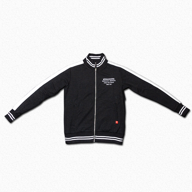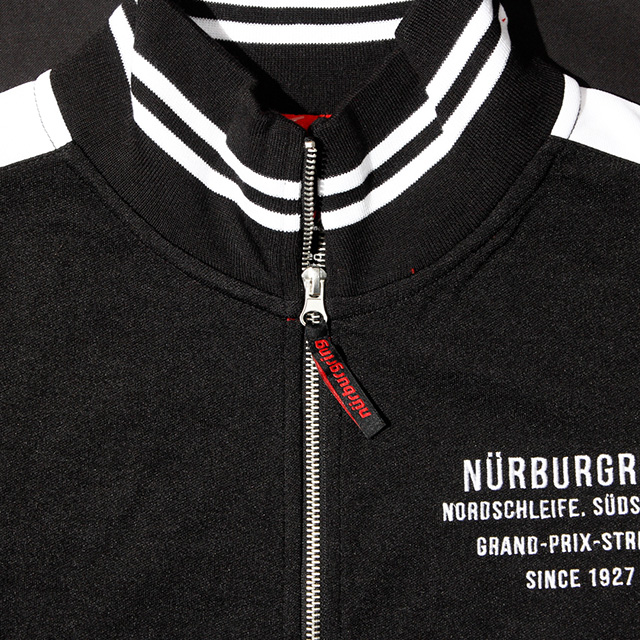 ジップ付きのポケットが計3カ所ついたジャケット。保温性も保たれています。Nurburgringのロゴの周りにはニュルの名所(コーナー名)が書かれています。