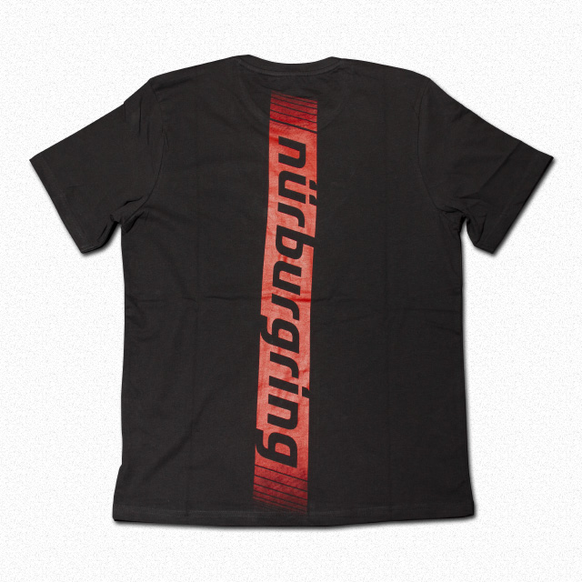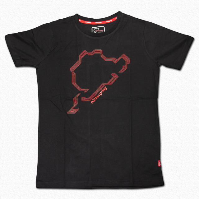 ファンコレクション2018のTシャツ。ニュルブルクリンクのシルエットがレッドストライプで描かれており、シンプルながら目を引くデザインです。サイドの小さなロゴラベルもアクセントとなっています。サイズはS、M、Lをご用意しています。