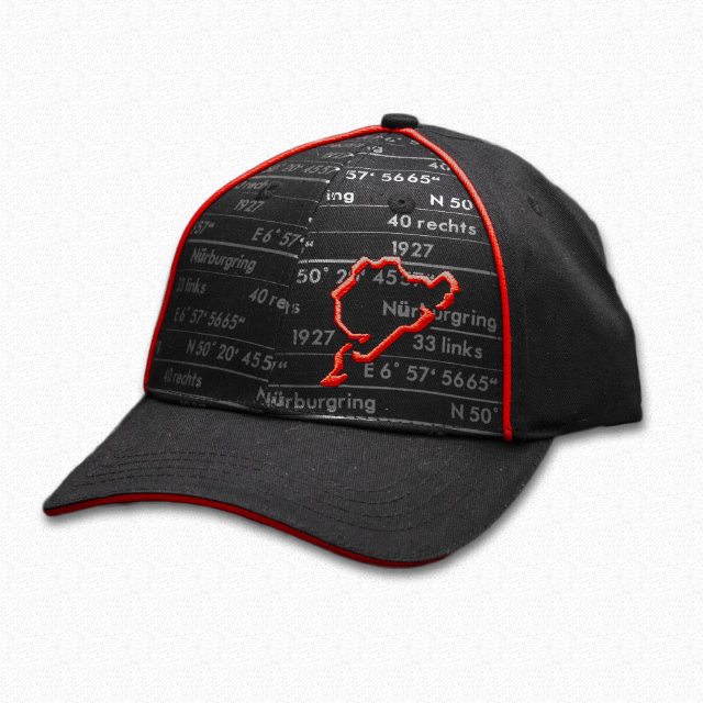 新登場の6パネルキャップ。経度緯度やオープン年(1927)など、ニュルブルクリンクにまつわる数字や文字のプリントを背景に、ロゴの立体的なシルエットがアクセントになっています。