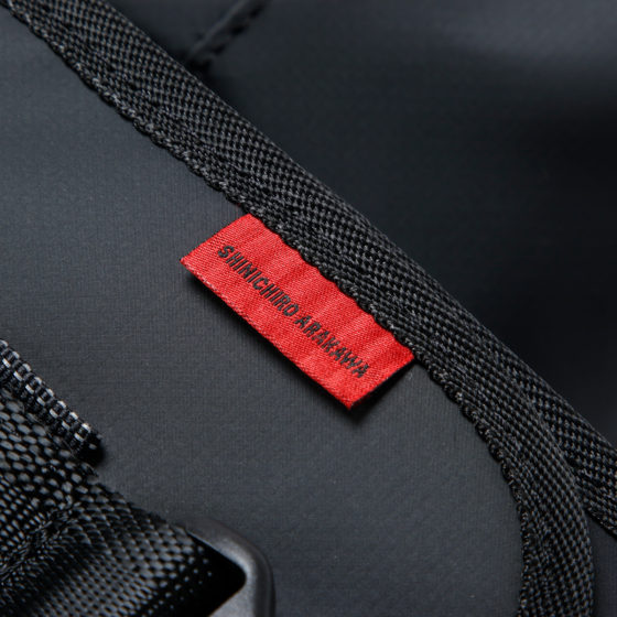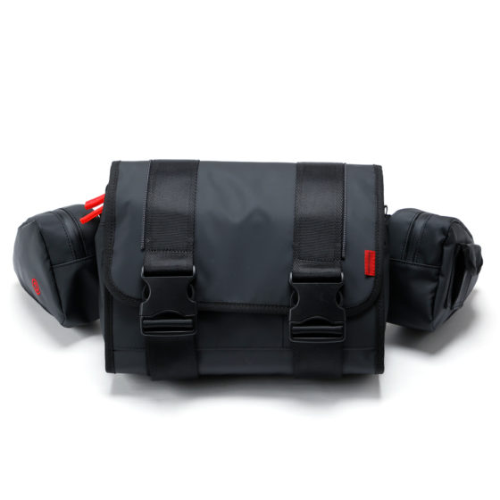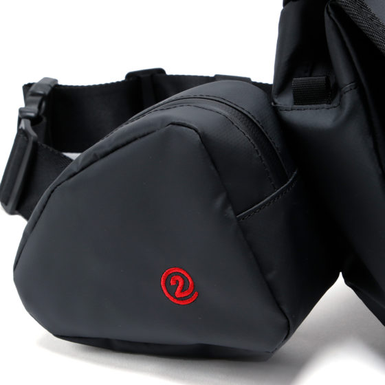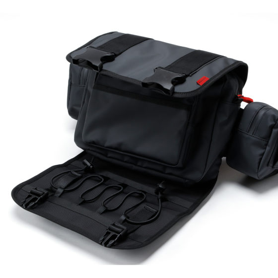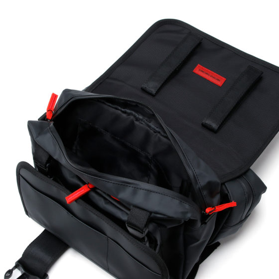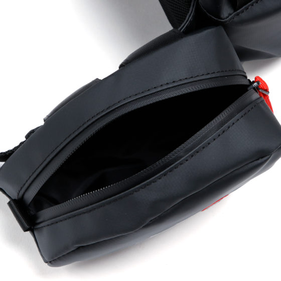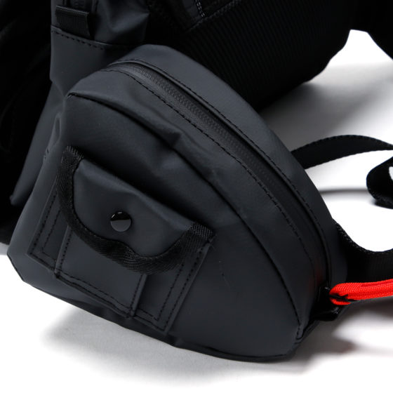 3:サイドポーチは実際に使うととても便利。さっと取り出したいモノの特等席です。ポーチはマジックテープで位置決めされ、取り外しも可能です。右のサイドポーチにはミニポケットも備わっています。尚、このサイドポーチの最も大事な特徴はファスナーを閉めた際に赤いスライダーテプがバッグ前面にくる様になっており、バイクのバックミラーでファスナーの閉め忘れ等が目視がしやすい様になっている点です。