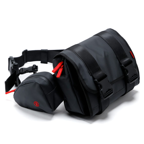 6:メッセンジャーバッグの様に、BAGを背中に斜めに背負う際、脇から肩にかけてベルトを通していただき本体ベルトと接続します。その際、必ず固定ベルトの長さ調整を行ってください。