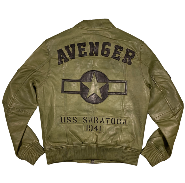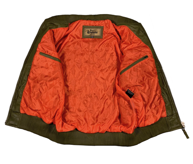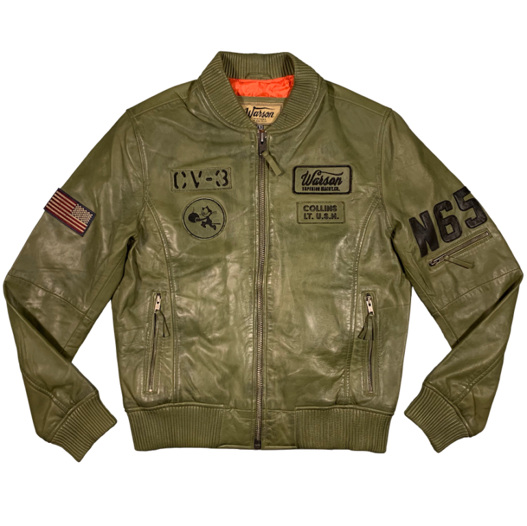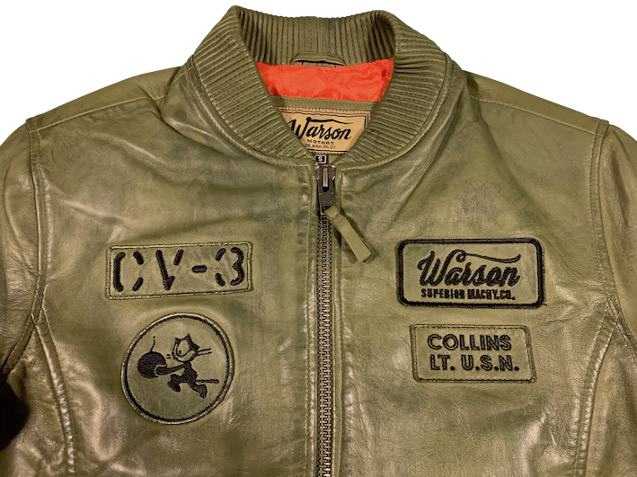 アメリカ海軍パイロットが着用していたウエアをイメージした、リブ付きブルゾンタイプの珍しいレザージャケット。カーキ色のなめされたシープレザーが鮮やかな一着です。背中に書かれた、USS SARATOGA 1941とは、アメリカ海軍の航空母艦にあたる、レキシントン級航空母艦の2番艦"サラトガ"の意。インナーは鮮やかなオレンジ色のキルティング素材となっております。
