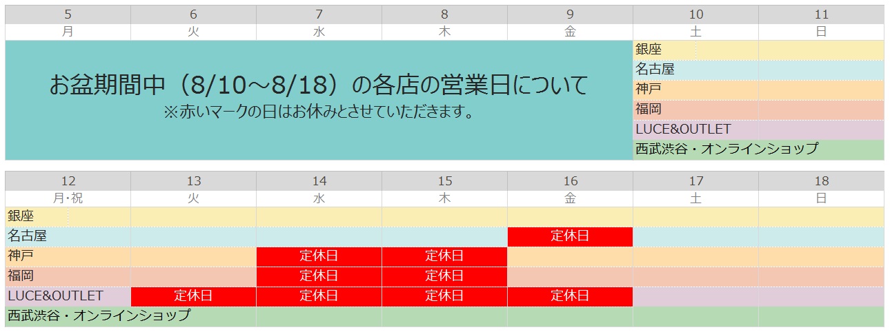 お盆期間中の各店の定休日につきまして、お知らせいたします。