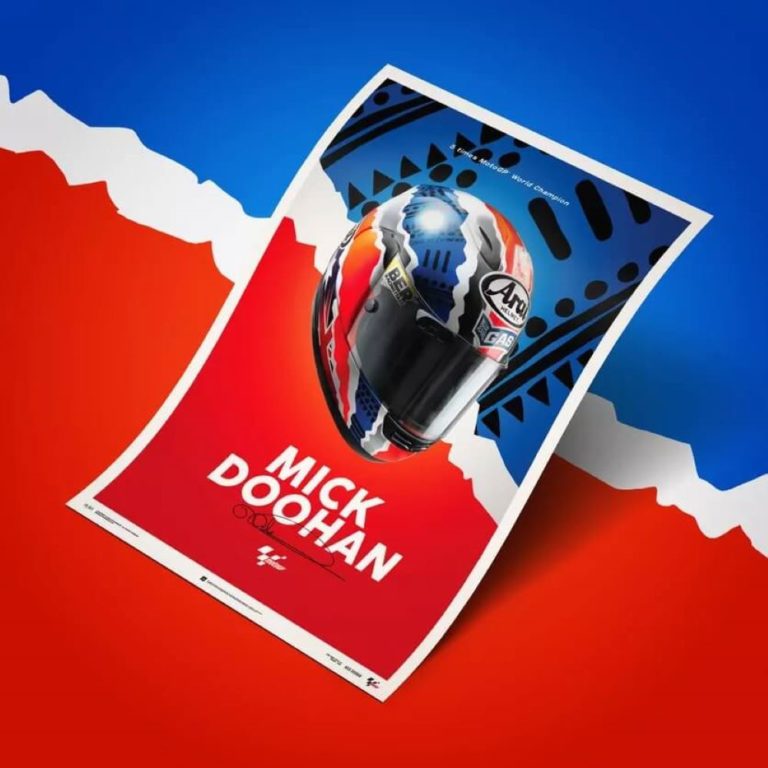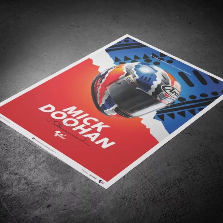 彼の独特なライディングスタイルとレバー式ブレーキを駆使したドライビングはその当時、他を寄せ付けない圧倒的な強さを誇っていました。95年から現在に至り、ホンダワークスのメインスポンサーを務めているレプソルカラーの先駆者でもあるドゥーハンの走りに魅了された方もきっと多いはず。そんなミック・ドゥーハンのポスターを飾りMotoGPを観戦してみては如何でしょうか。