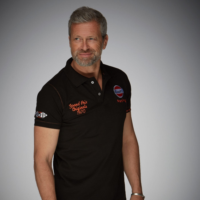 ブラックにオレンジの刺繍が入ったガルフのポロシャツ。