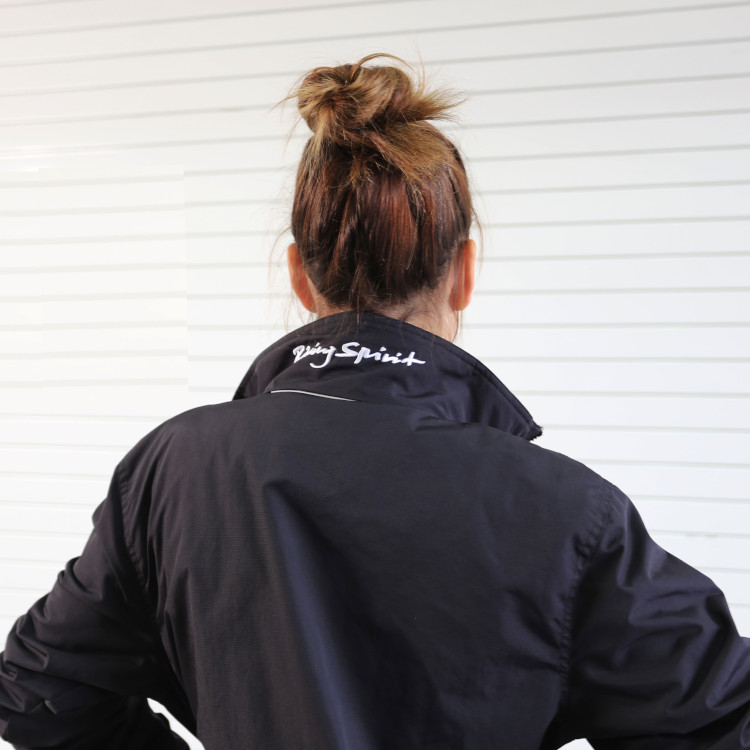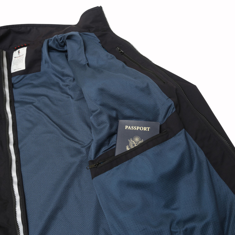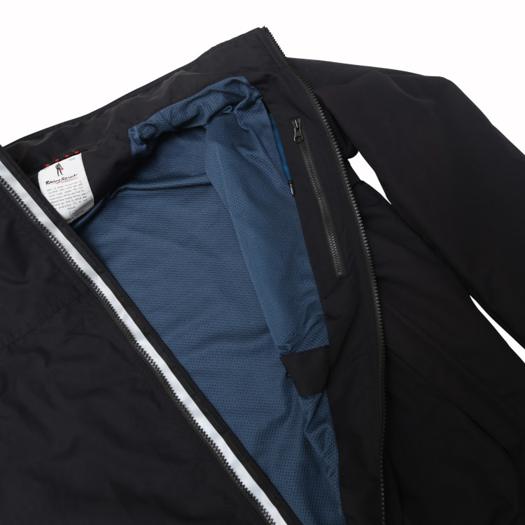 撥水効果あり、背中の襟部分にはRacing Spiritの刺繍。インナーはメッシュ素材でポケットが全部で3カ所。