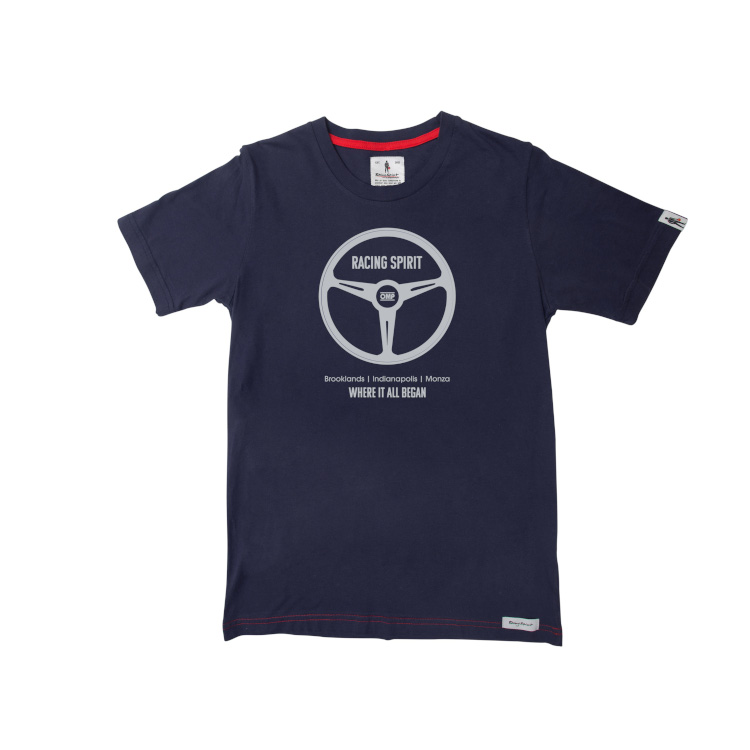 OMP RACINGのクラシックなステアリングホイールが描かれたプリントTシャツ。