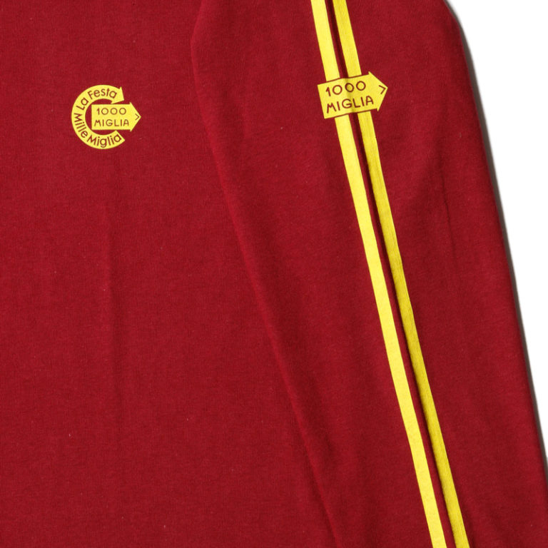 La Festa Mille Miglia公認のロング丈Tシャツ。左袖の肘周りにのみ、部分的にプリントされた2本のストライプがレーシーな印象を与え、ボルドーにはイエロー、ホワイトにはグリーン、グレーとネイビーはホワイトのストライプそれぞれ加わり、カラーのコンビネーションやデザインは、クラシックカーのカラーリングを彷彿とさせます。サイズレンジは、レディース用のXSサイズからメンズのXLサイズまで。カラーは4色展開。着心地のよい素材感となっております。