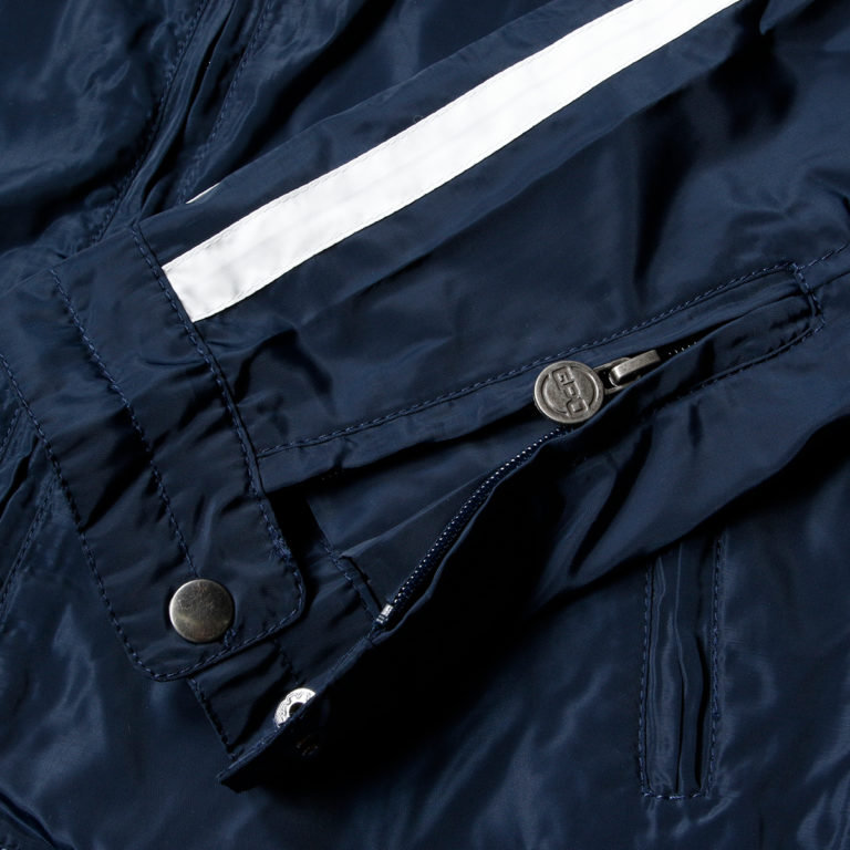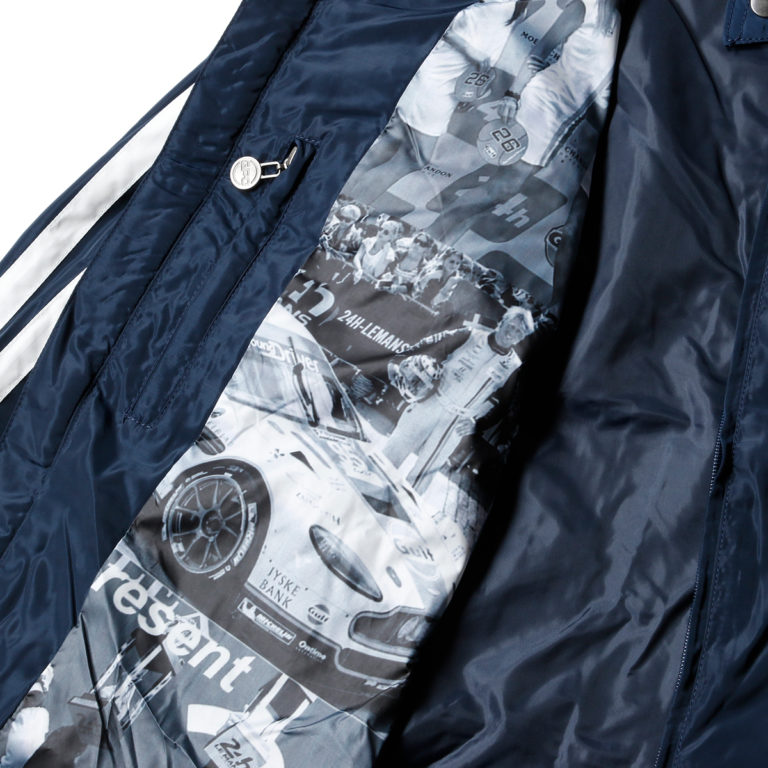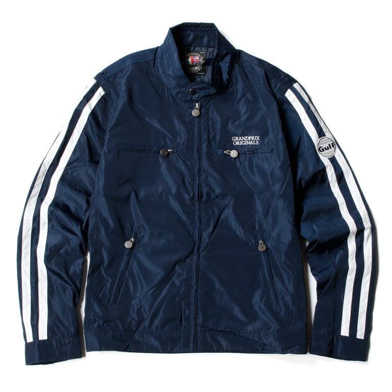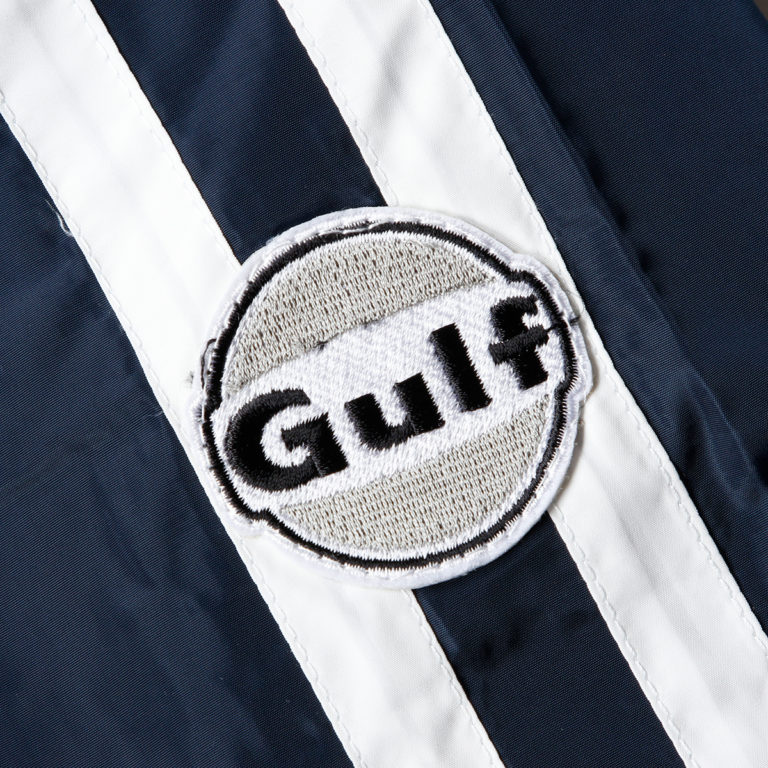 ネイビーにホワイトの2本のレーシングストライプが入ったジャケット。ガルフのロゴもホワイトに統一され、ネイビーとホワイトのツートンで、さりげなくガルフをアピールできるデザイン仕様になっています。インナーには、ガルフカラーのマシンなどがモノクロプリントされています。