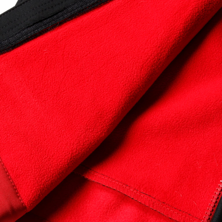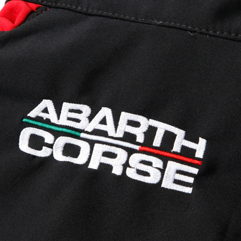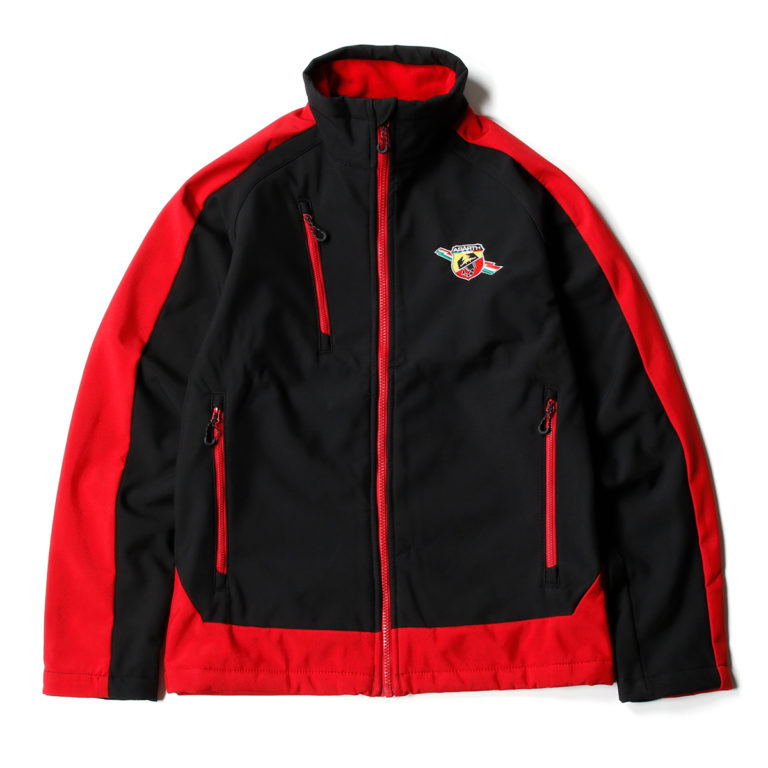 ブラックとレッドのツートンが鮮やかなアバルト・コルセのソフトシェルジャケット。胸元のロゴは刺繍。裏起毛がついているので、保温性も確保されています。