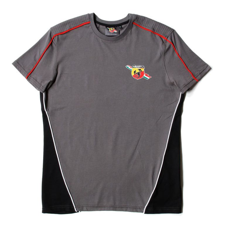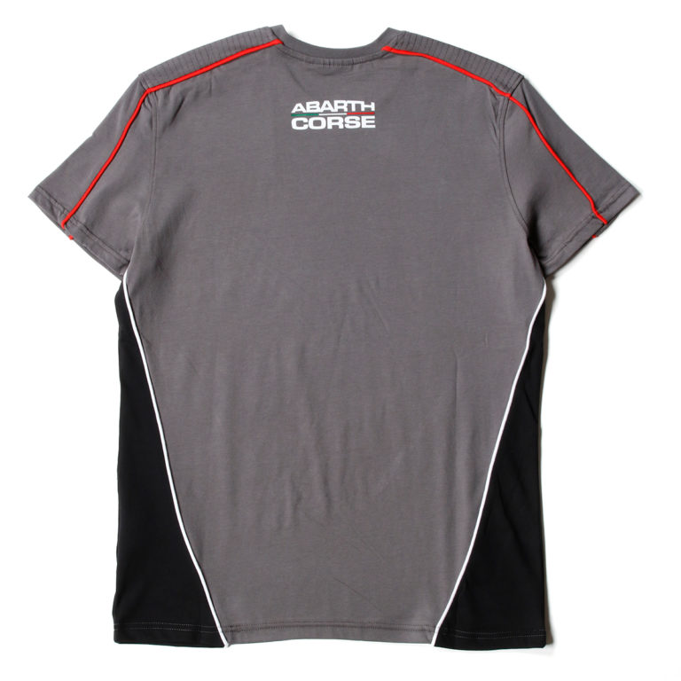 アバルト・コルセのTシャツ。 胸元のロゴはプリント。こちらも、スウェットやポロシャツと同様に、アバルトの純正色である"グリジオ・レコード"をイメージさせるグレーと、ホワイトの2カラー展開になります。