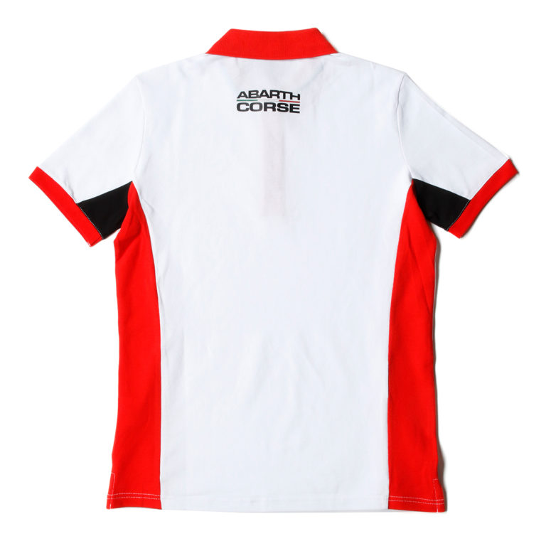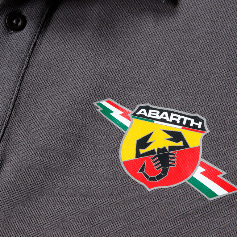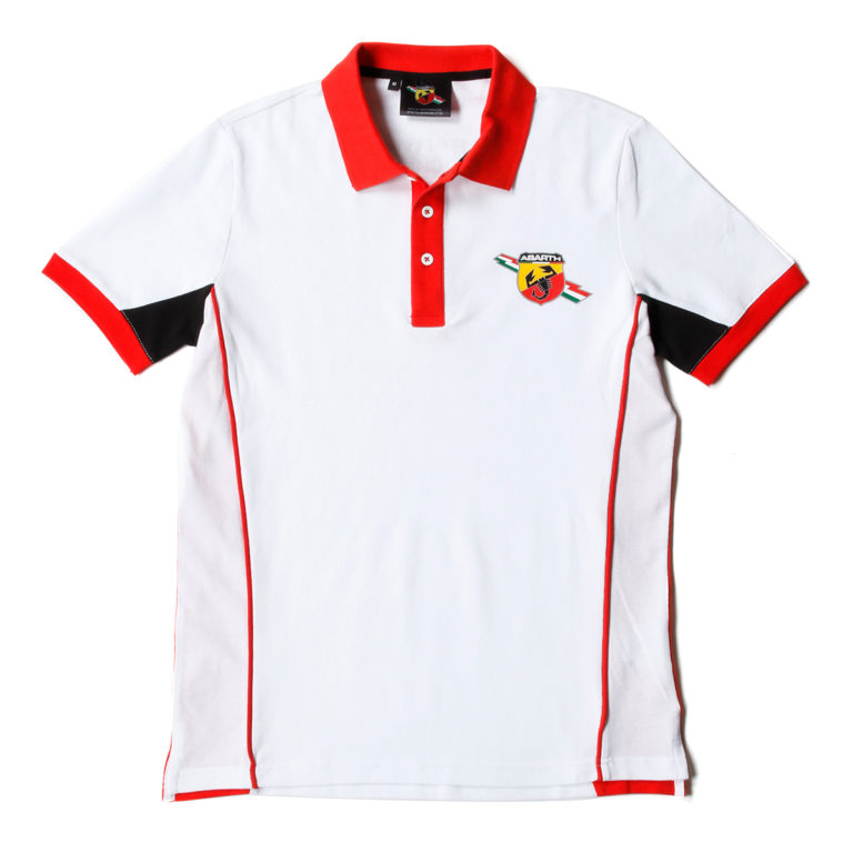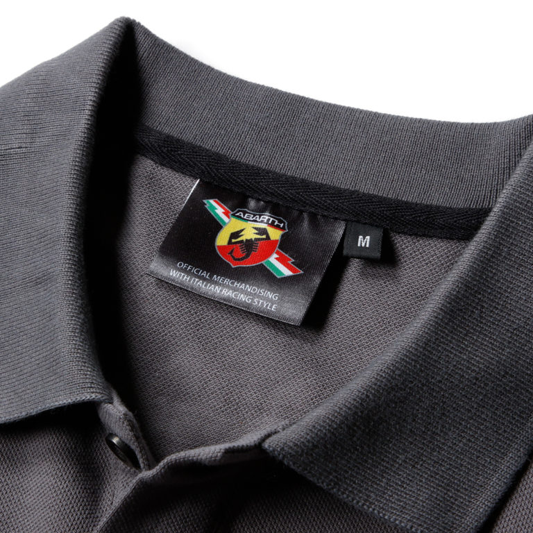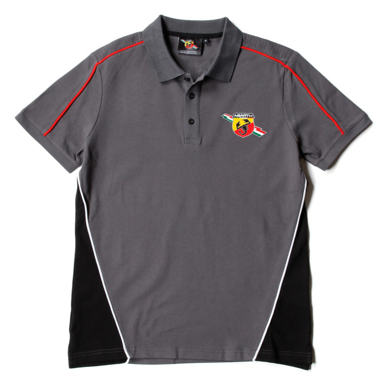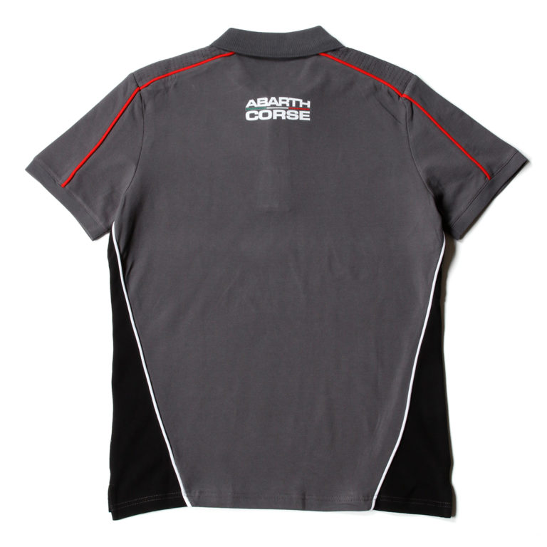 アバルト・コルセのポロシャツ。 胸元のロゴはプリント。カラーは、アバルトの純正色である"グリジオ・レコード"をイメージさせるグレーと、ホワイトの2カラー展開。