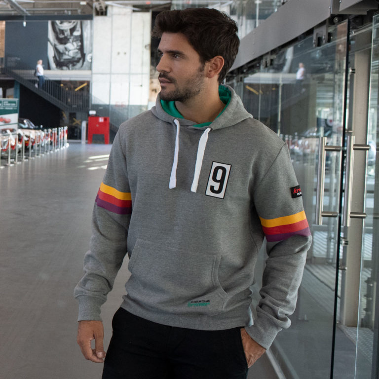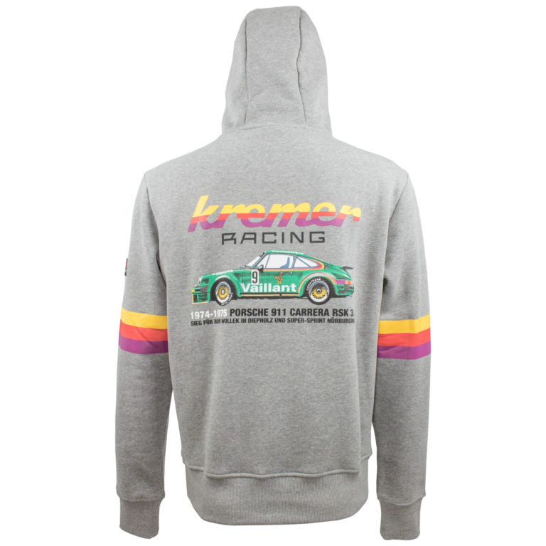 1975年7月20日に行われた、DRM(ドイツレーシングカー選手権)第5戦ディープホルツでデビューを果たした、ボブ・ウォレックのポルシェ911RSR 3.0のVaillantカラーのマシンがバックプリントされたフードパーカー。背中のクレーマーのロゴや両腕をぐるりと1周したストライプは、まさにVaillant仕様。レトロを感じさせるデザインに仕上がっています。左胸にはゼッケン9がプリントされています。