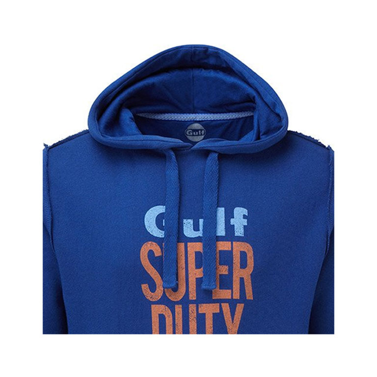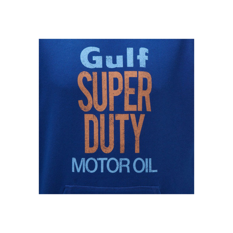 鮮やかなブルーを基調としたガルフのフードパーカー。 正面にプリントされたSUPREME GULF MOTOR OILは、過去にガルフのオイル缶として実際に販売されていたデザインをモチーフとしており、ウエア全体でユーズド感を表現しています。