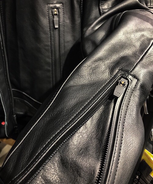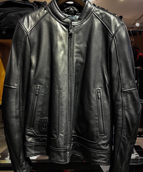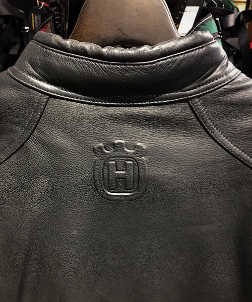 脇部分のレザーはパンチングになっており蒸れを逃がしてくれる機能性。勿論、肩・肘・脊椎にはCE規格のSEESMART製着脱式プロテクターを装備しています。首元と、フロント右ポケット部分にはハスクバーナのブランドロゴである銃身と照準がついております。バイクやシーンを選ばないシックなデザインも魅力です。