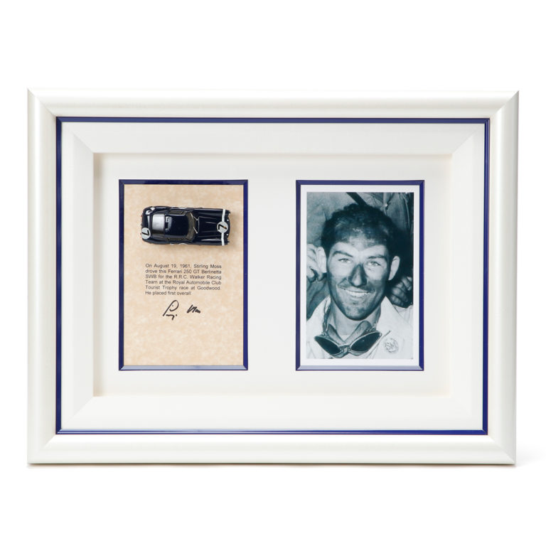 仕様:額装フレーム入り(壁掛け可能)、スターリング・モス 直筆サイン入り、1/43モデルカー・プロマイドつき