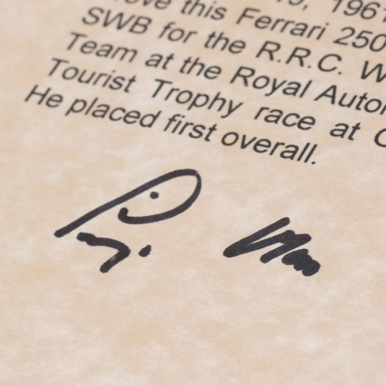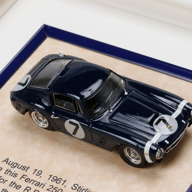 額装に入ったモデルカーは、イギリスのロブ・ウォーカー・レーシングというプライベーターチームから参戦し、1961年のグッドウッド・ツーリスト・トロフィーで勝利した1/43スケールのフェラーリ250GT SWB。フェラーリで勝ちまくっていたモスがフェラーリから参戦するきっかけにもなったマシンで、モス自身も「史上最高のマシン」と称えていました。本来であれば、この250 GT SWBと同じロブ・ウォーカー・レーシングカラーの(フェラーリの)F1マシンが実現するはずでした。