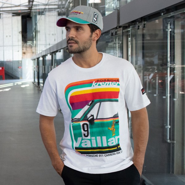 1975年7月20日に行われた、DRM(ドイツレーシングカー選手権)第5戦ディープホルツでデビューを果たした、ボブ・ウォレックのポルシェ911RSR 3.0のVaillantカラーのマシンがバックプリントされたフードパーカー。背中のクレーマーのロゴや両腕をぐるりと1周したストライプは、まさにVaillant仕様。レトロを感じさせるデザインに仕上がっています。左胸にはゼッケン9がプリントされています。