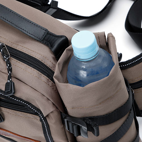 細かい物も分けて入れられるサブスペースに加え、外側にドリンクホルダーが付いているのでペットボトル飲料の結露から、カバンの中が濡れるのを防いでくれます