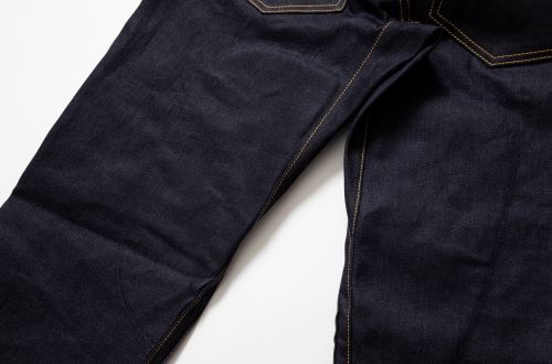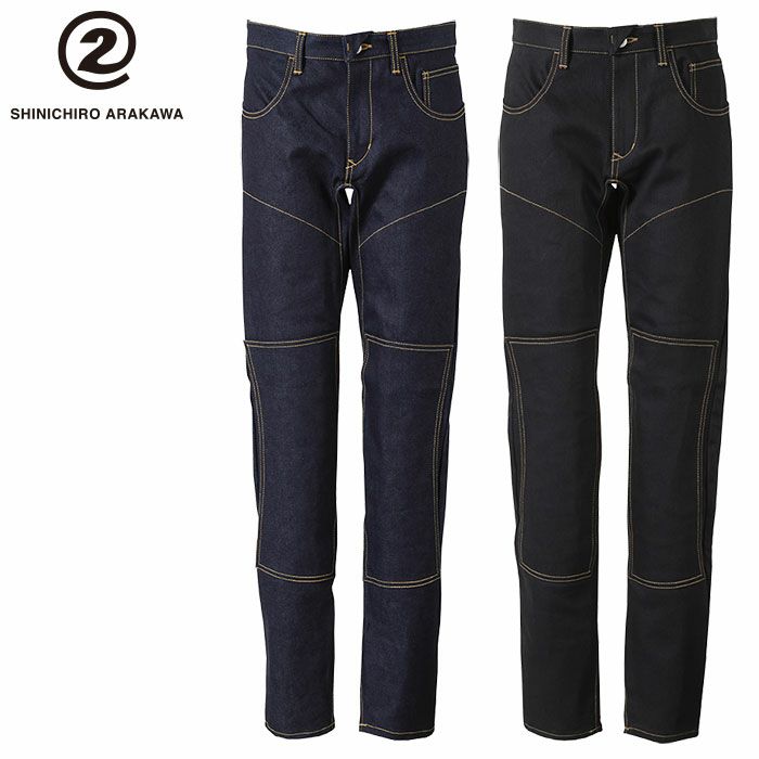 人気のSHINICHIRO ARAKAWA 耐熱パンツ。イエローステッチが映えるインディゴデニムとブラックデニム仕様。耐熱性は以前のモデルと変わらず、内腿とふくらはぎの内側など車体に触れる部分に耐熱シートが内側に縫い付けられています。膝プロテクターの装着が可能なポケットも装備。テーパードなシルエットは乗り降りの多い車やバイクで使いやすく、足首周りもスッキリな作りです。