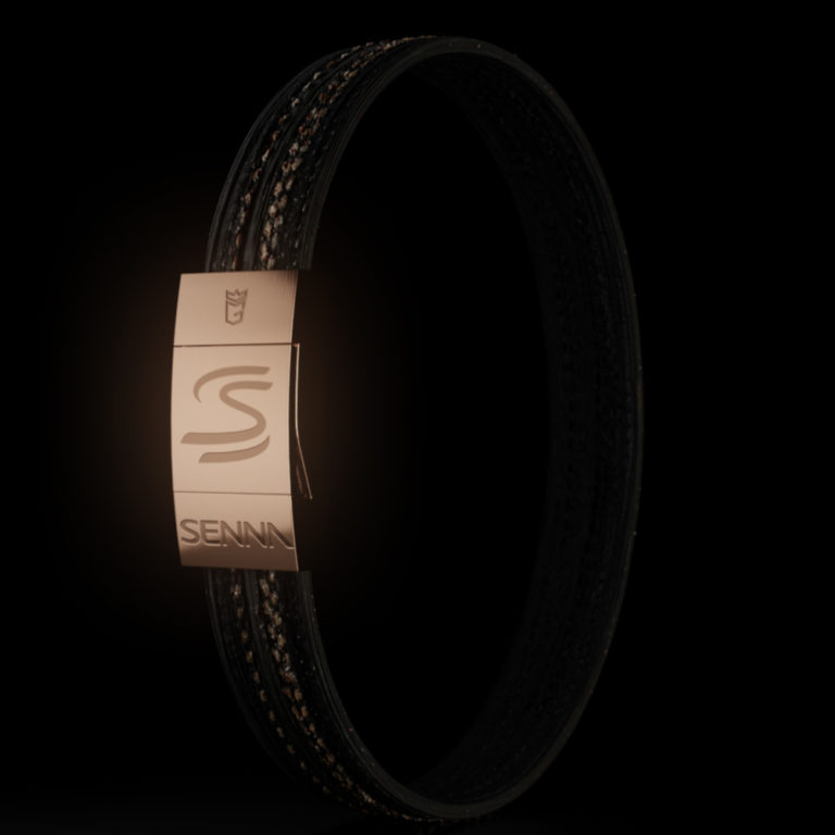 ブレスレットもレジェンドの名に相応しい仕様となっており、メモリアルなタイヤに合わせて、留め具部分も、サテン仕上げ、18Kピンクゴールドを使用するこだわり。また、アイルトン・セナ財団公認アイテムで、今回のブレスレットの制作にあたり、セナ財団の会長であるビビアン・セナの娘、ビアンカ・セナや元F1レーサーのブルーノ・セナも携わっています。セナ財団公認の証である、セナ・ダブルエスとMONGRIPのロゴやシリアル№がレザー刻印。世界限定161のメモリアルアイテムです。