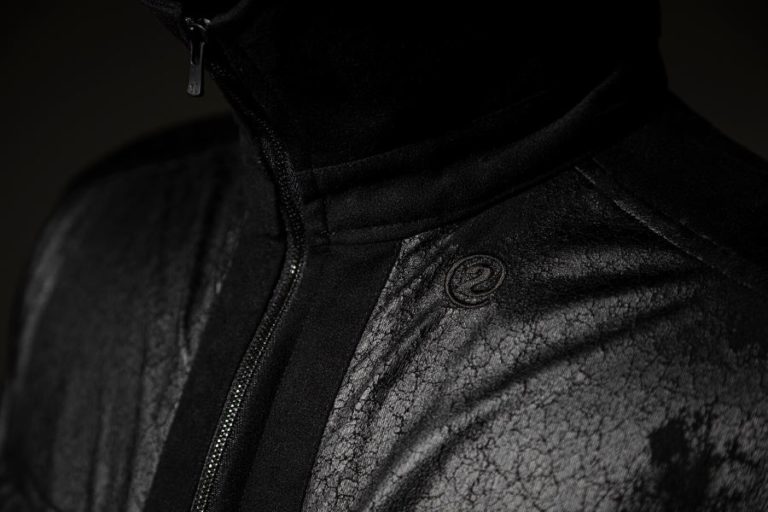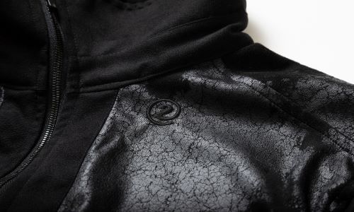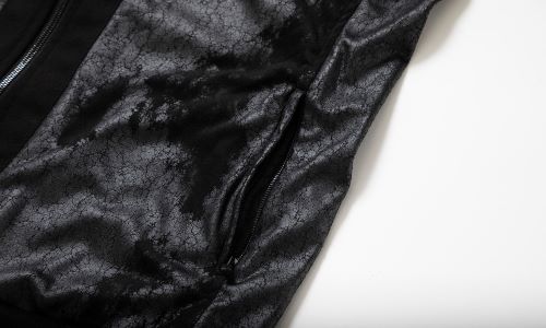 クラッキングレザー調のプリントが施された薄手のストレッチ素材のジャージ