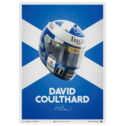 2000年にマクラーレン・メルセデスに所属していた、デビッド・クルサードのヘルメットポスター。この年は自身最多となるシーズン3勝をマーク。ミカ・ハッキネンやキミ・ライコネンのセカンド・ドライバーとして、マシン開発やチームに貢献する姿勢はマクラーレンから高く評価されました。デビット・クルサード・オフィシャルライセンス商品。