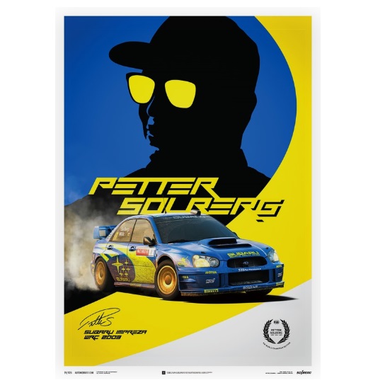 2003年のWRCでドライバーズチャンピオンに輝いたスバル・インプレッサとサングラスをかけるペター・ソルベルグのシルエットが描かれたポスター。2003年のWRCは、カルロス・サインツ、セバスチャン・ローブ、リチャード・バーンズとの4つ巴のチャンピオン争いとなったシーズン。中盤戦以降から巻き返したソルベルグが最終戦グレートブリテンも制し、ローブと1ポイント差で逆転チャンピオンを獲得。世界中のスバリストを興奮させるドラマチックなシーズンとなりました。インプレッサがカウンターを当てながらアクセル全開で豪快に土煙を上げて走る姿は、いつも全開でドライビングするソルベルグらしい1枚に仕上がっています。ペター・ソルベルグ・オフィシャルライセンス商品。