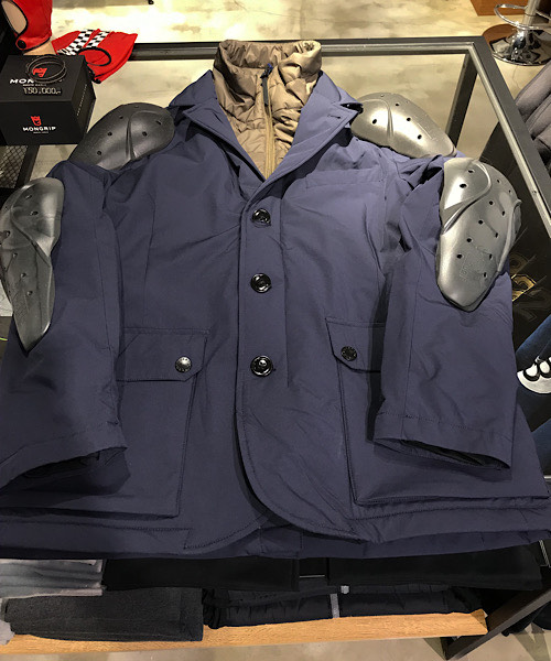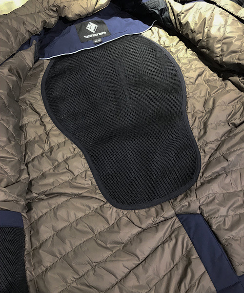 見た目からはプロテクターが入るウェアとは思えないブレザータイプのウェアですが肩肘には取り外し可能なプロテクターを標準装備。背中には脊椎プロテクター用のメッシュポケットを備えます。