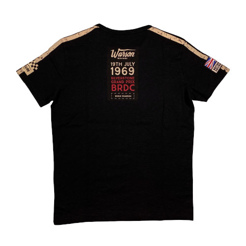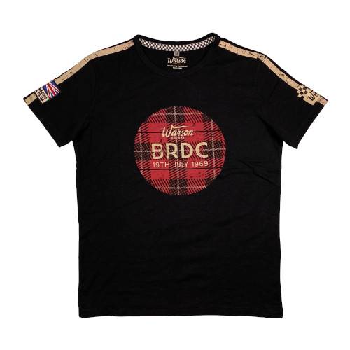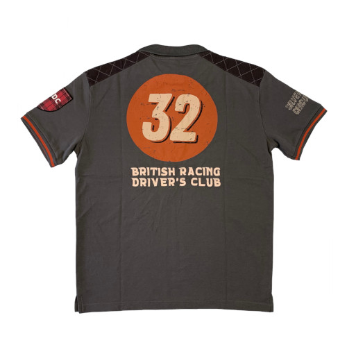 1969年F1イギリスGPに勝利したジャッキー・スチュワートをモチーフとしたポロシャツ。胸部分にはスチュワートもメンバーに連ねていたBRDCの刺繍ワッペンと、左右の腕部分には、彼のシンボルでもあるタータンチェック柄の紋章、1969年イギリスGPの文字がそれぞれプリントされています。背中部分には、65年のイタリアGPでF1初勝利を飾った際のゼッケンと思われる32の数字が、BRDCのロゴと共にプリントされています。