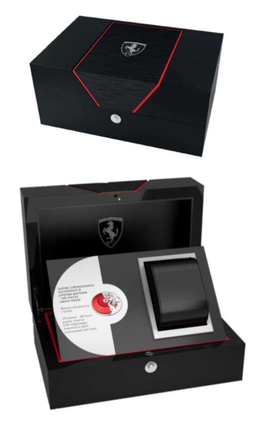 44mmのグレイIPケースにサファイアクリスタルにて制作。市販車のメーターパネルを連想させたカーボンファイバーダイヤルと3つのスモールセコンド。インデックスはスイスのスーパールミノヴァを採用。より暗いシチュエーションでも視認性が高まっています。背面には、世界限定199本のシリアルナンバーが刻印され、ETA製のオートマティック、スイスムーブメントを搭載。赤いステッチがついたブラックのレザーストラップは、市販車フェラーリに採用されているシートパターンをイメージしたデザインに仕上がっています。