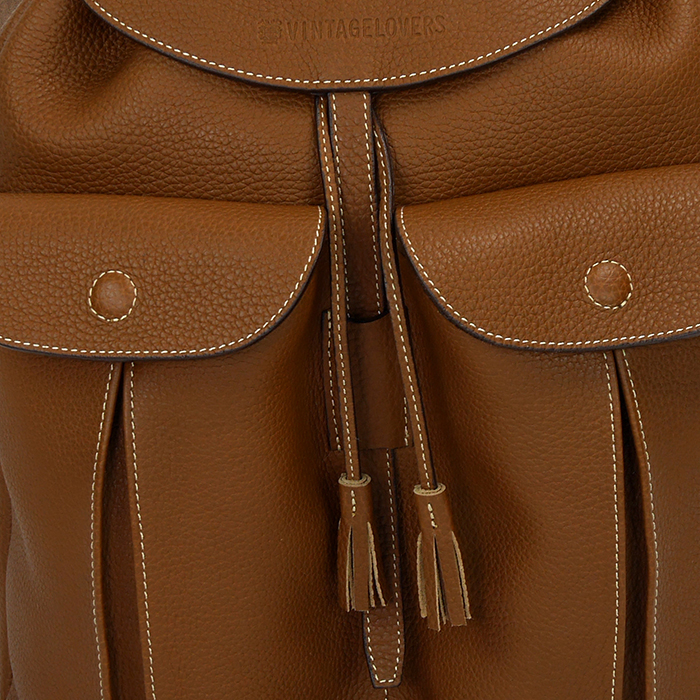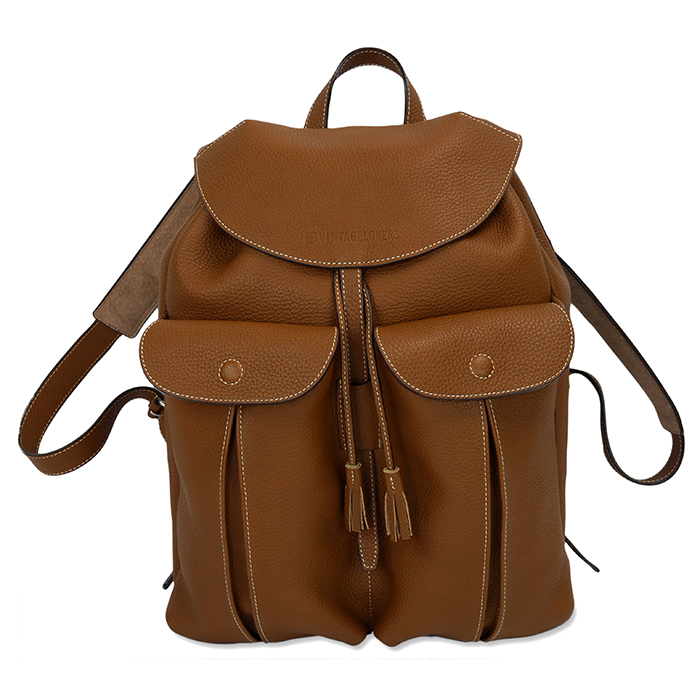 ヴィンテージラバーズ型押しロゴ入りのオールブラウンレザーのバックパック。左右にアウトサイドポケットが2つついており、細かなホワイトステッチとの色使いが大変オシャレです。