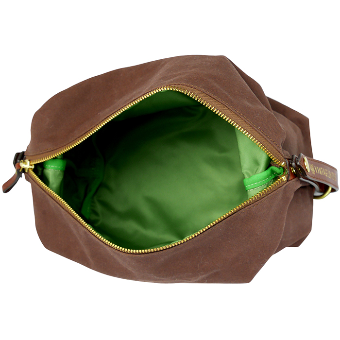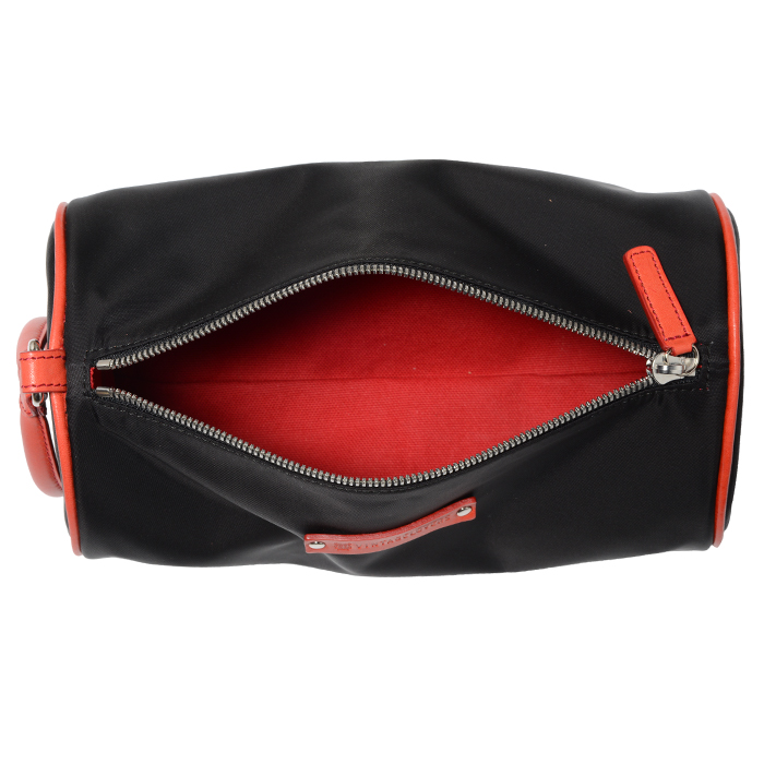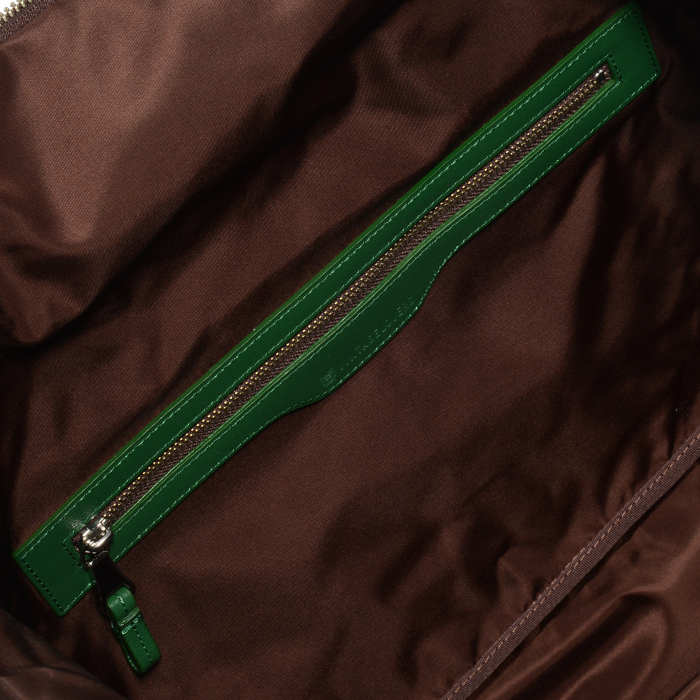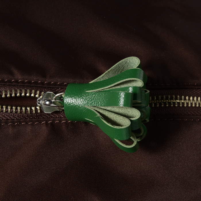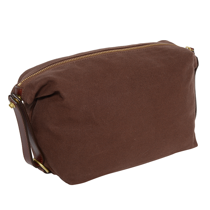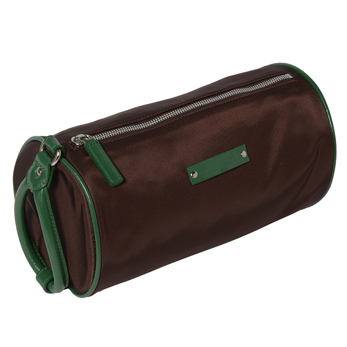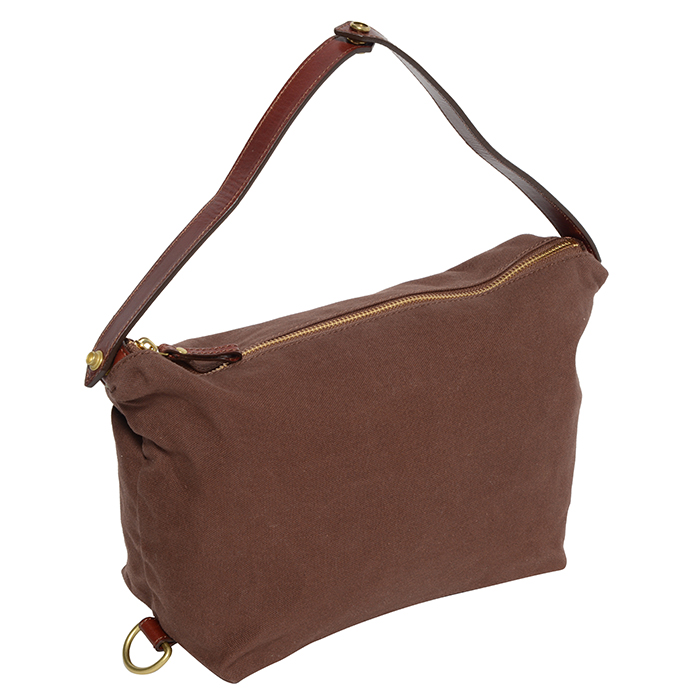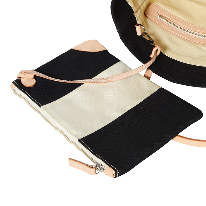 財布や携帯電話などが収納できる小型タイプのポーチ。左右の持ち手のレザーを外し、ポーチの中央で持ち手をひとつにジョイントさせることもできます。