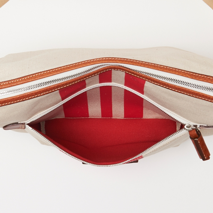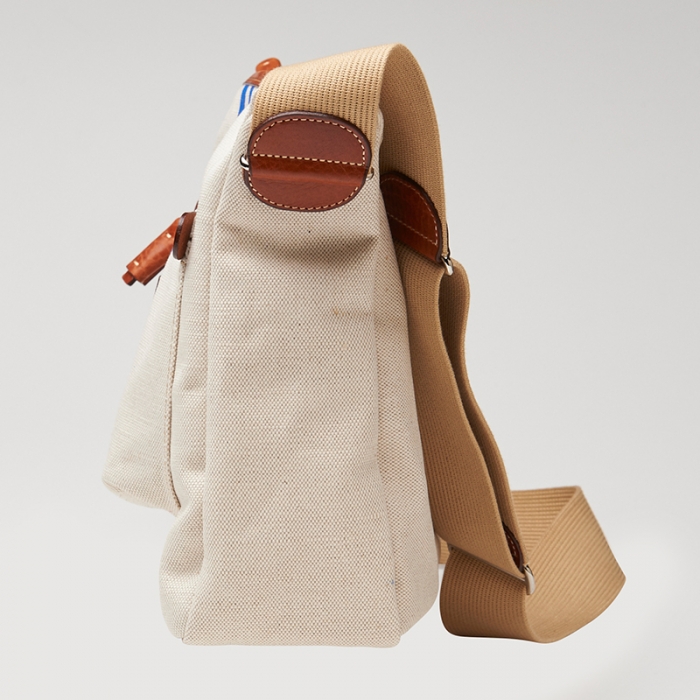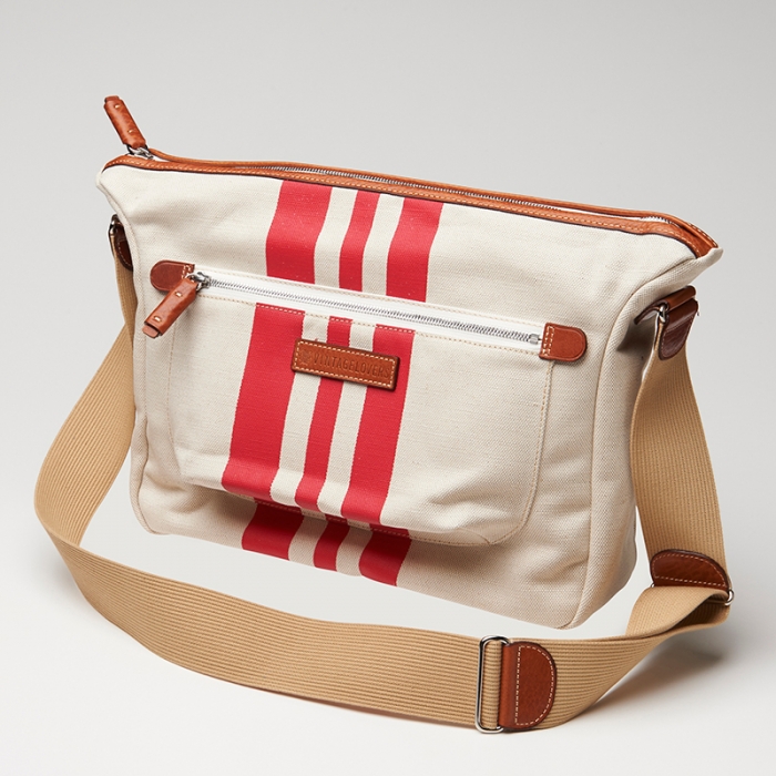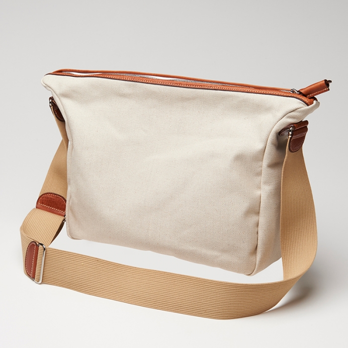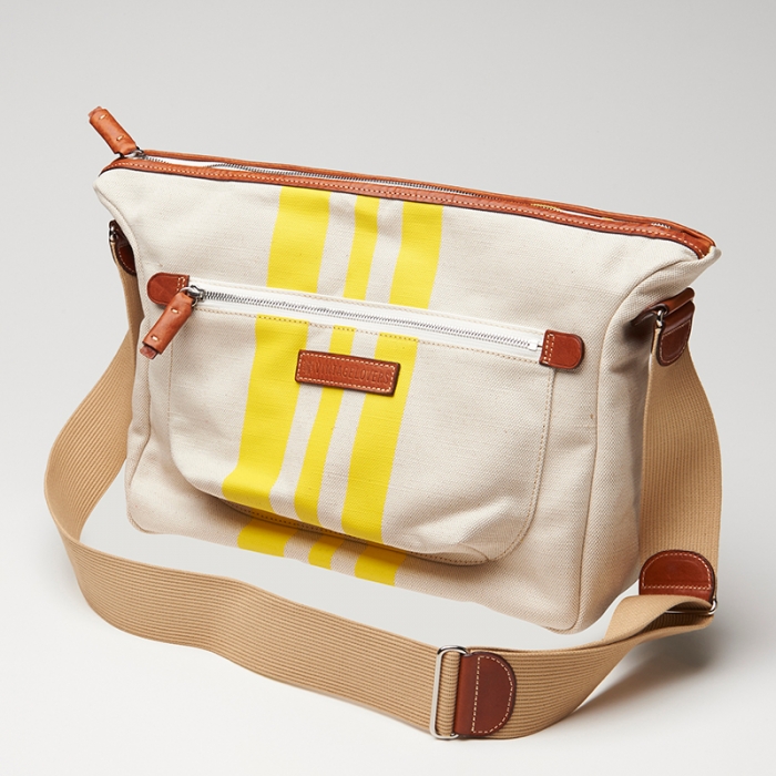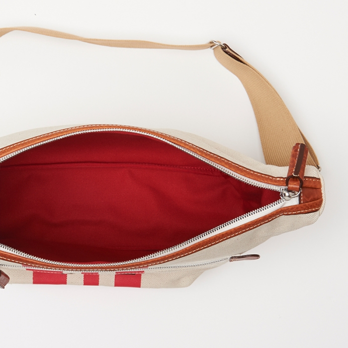 3本のレーシング・ストライプが鮮やかなキナリ素材でできたショルダーバッグ。雑誌がちょうど入るくらいの間口があり、マチ幅もあるので、厚みのあるアイテムも収納可能。アウトサイドポケットには長財布や小物が収納できます。※内ポケットはございません。