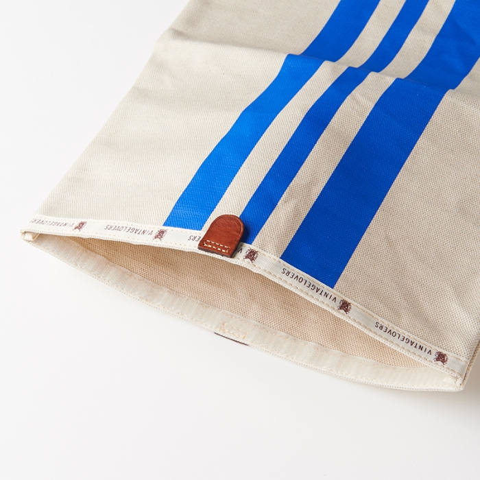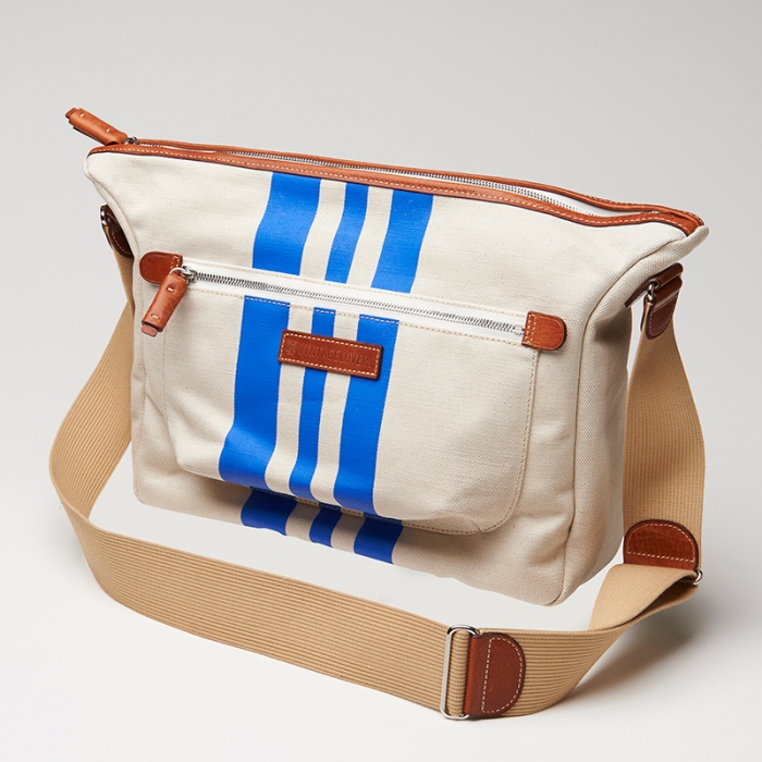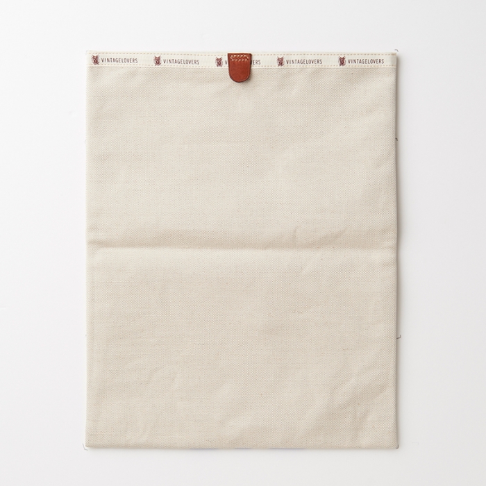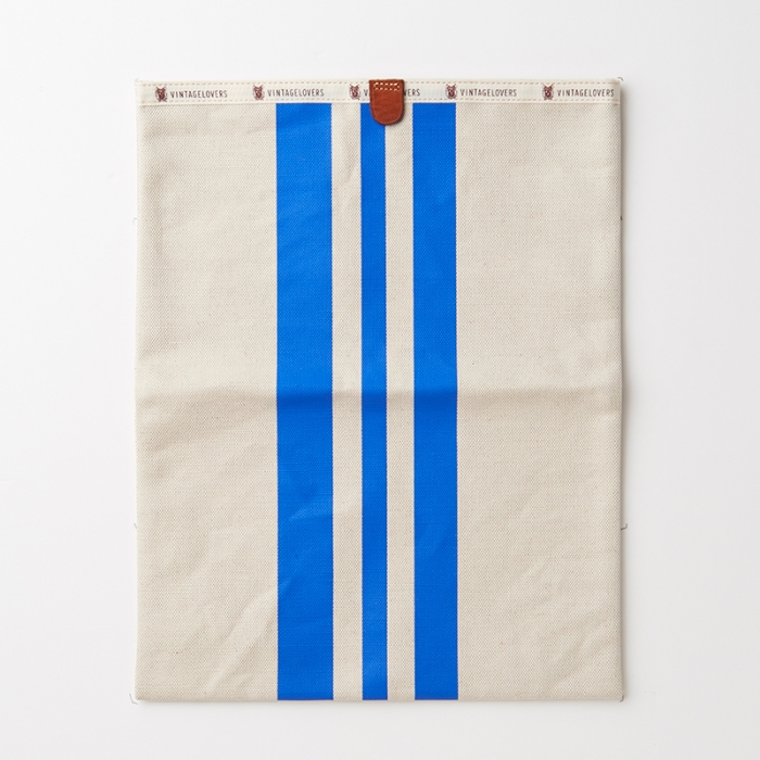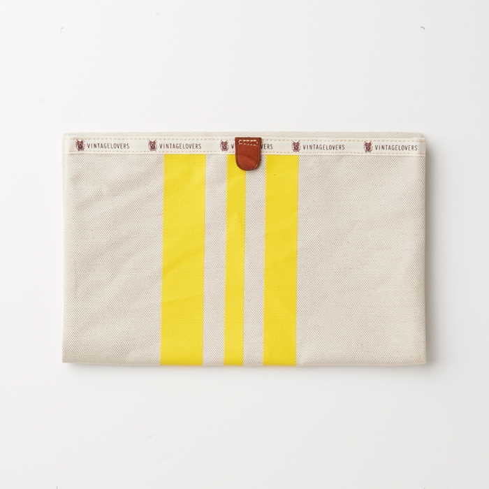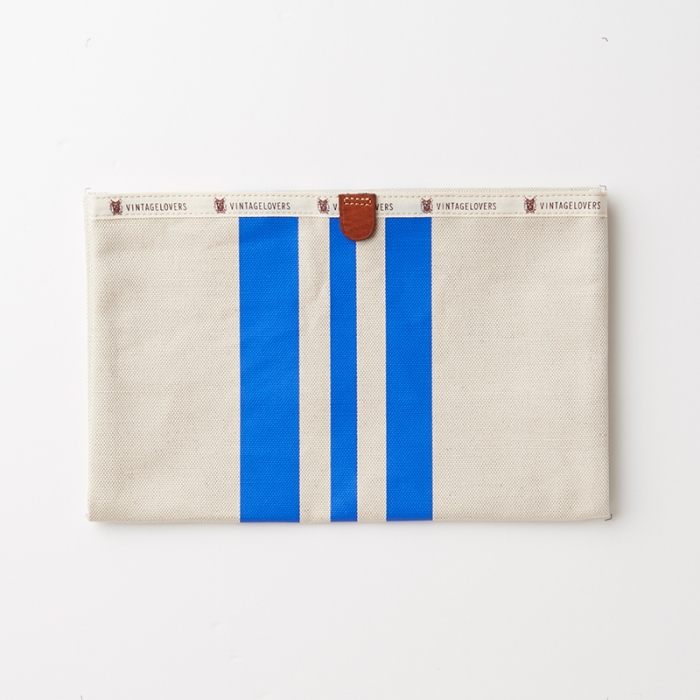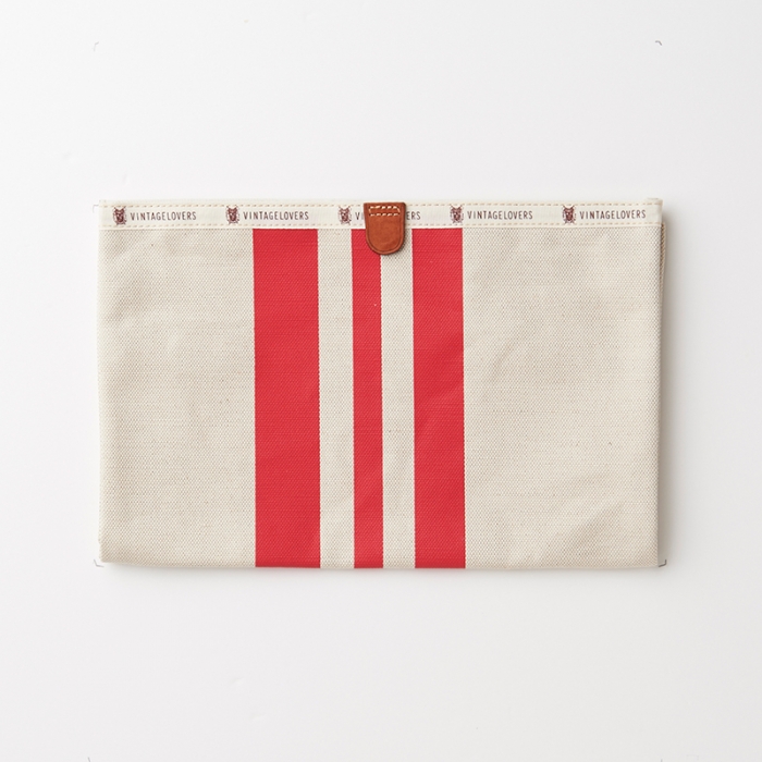 3本のレーシング・ストライプが鮮やかなキナリ素材でできたドキュメントケース。A5サイズであればクラッチバッグのように折り畳んだ状態で持ち運びができ、財布やタバコ、タブレットも収納可能です。また、クチ部分にベルクロがついているので、中身が飛び出てしまう心配もございません。