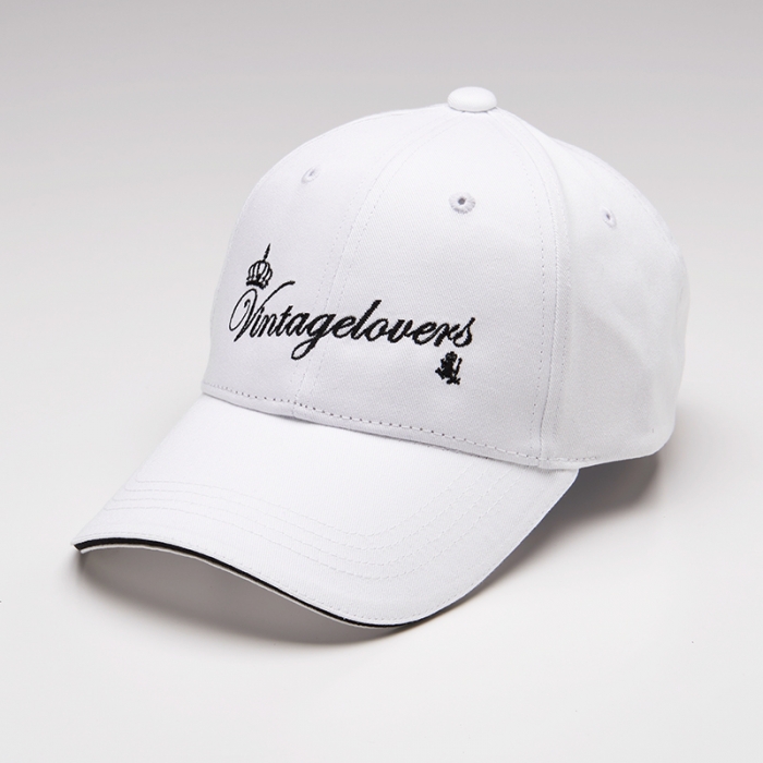 ヴィンテージラバーズのブランドロゴの筆記体が刺繍されたベースボールキャップ。ベルクロでサイズ調整が可能です。