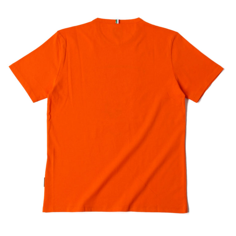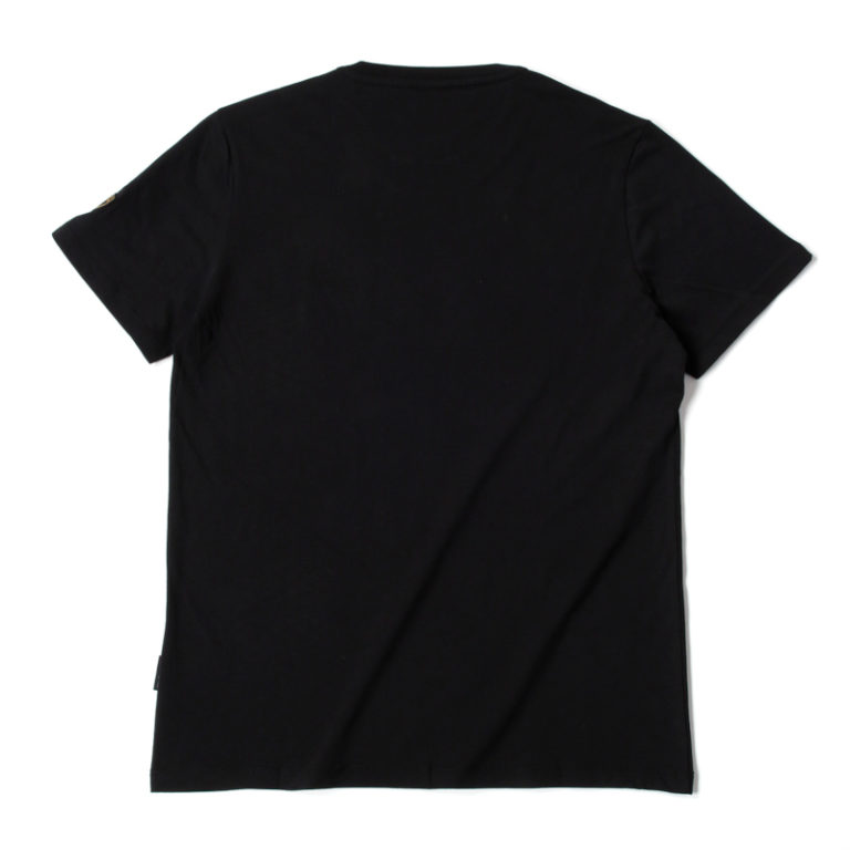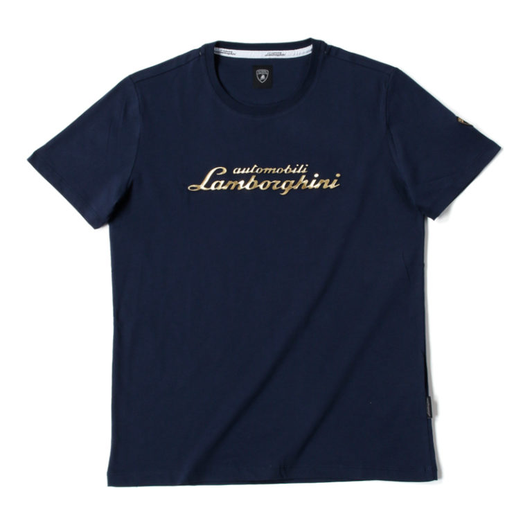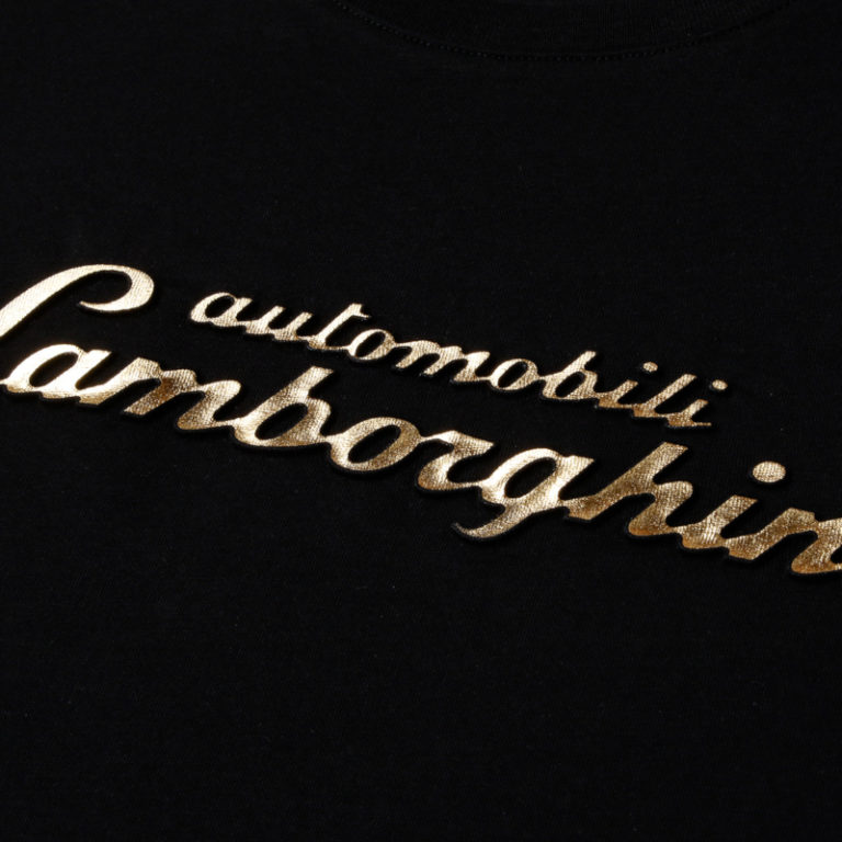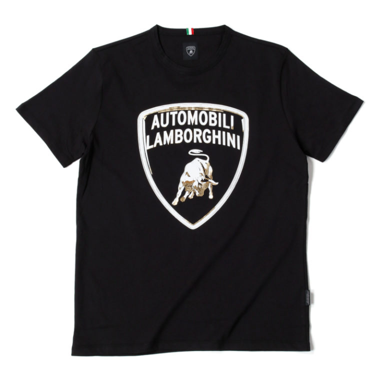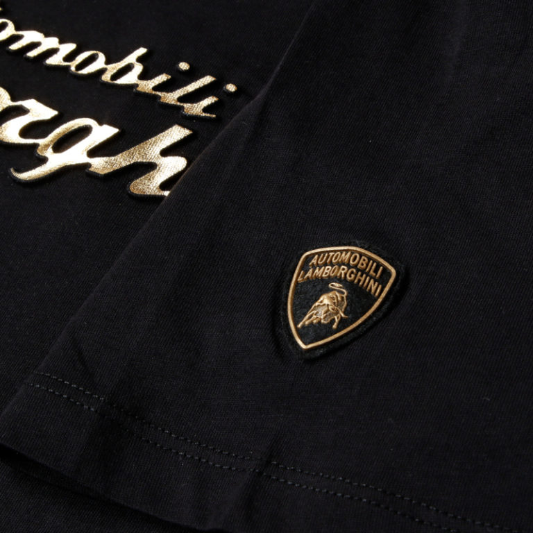 光沢感のあるゴールドの3DロゴがプリントされたTシャツ。ランボルギーニの実車にも装着されているエンブレムと同様に、立体的な手触り感が再現されています。