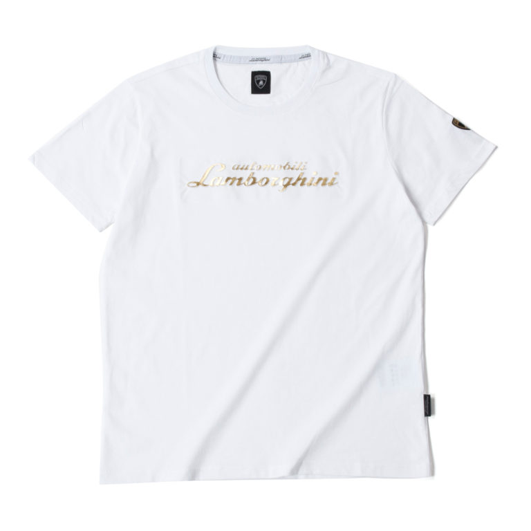 立体的なランボルギーニのエンブレムがプリントされたTシャツ。ホワイトと光沢感のあるゴールド(またはシルバー)をアクセントとして取り入れたことで、オシャレでクラシカルな演出がなされています。