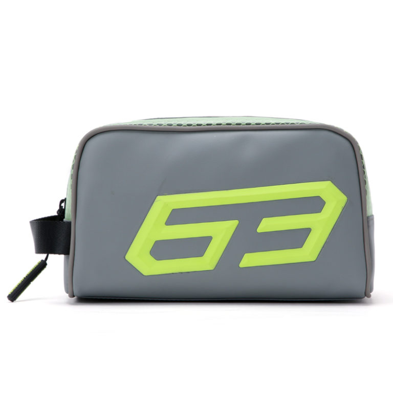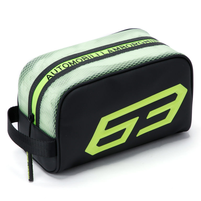 蛍光イエロー+ツートンのカラーコンビネーションが鮮やかなウォッシュバッグ。サイドに大きくあしらわれた「63」の数字は、ランボルギーニ社が設立された年の1963年に由来しています。旅行用のポーチ、小物入れ、サイドバッグとしてお使いいただけます。ランボルギーニの巾着つきです。
