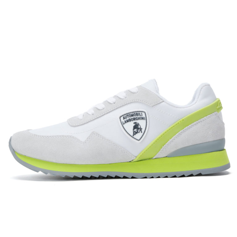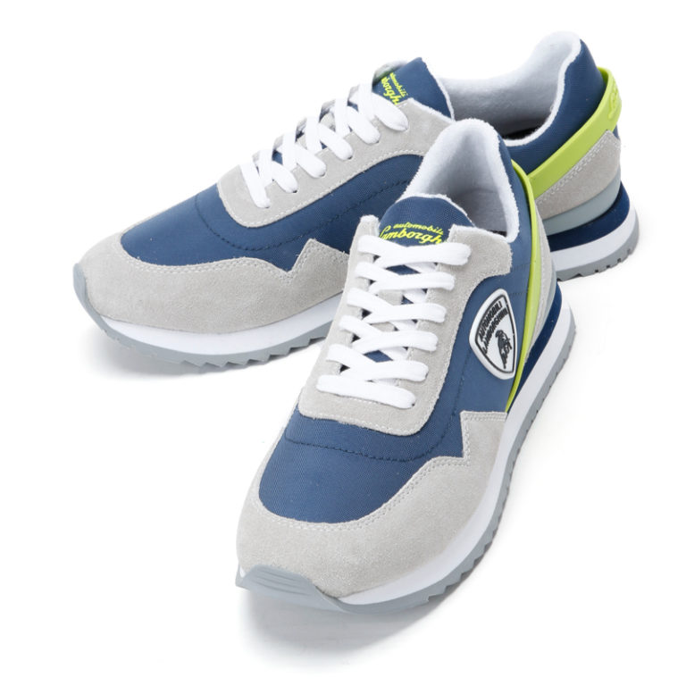 ランボルギーニのエンブレムがあしらわれたナイロンとスエードのコンビのランボルギーニ・スニーカー。 コーティング加工が施されたナイロン製アッパーとスエードのコンビに、アッパーとソールに描かれた蛍光イエローのラインは、ランボルギーニのエッジの効いたボディラインさを主張。また、厚底ソールは、スポーツシューズでも幅広いシェアを誇る軽量なEVA製を採用。替え紐付き。