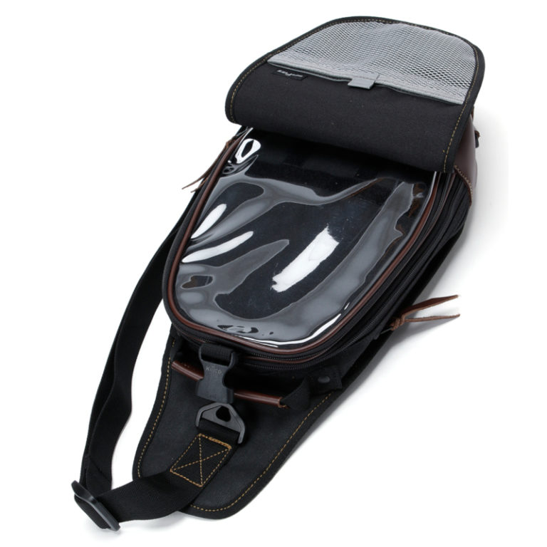 一番外のフラップ部分の内側には小銭やチケットなどを入れるメッシュポケット。上面から2番目はツーリングマップル(小さい方)が入る大きさを兼ね備えたマップポケット。また、仕切用のアジャスターも付属するので、スマホなどもずれないように収納することも可能。