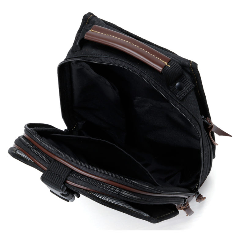 ナイロン素材のタンクバッグが多い中、あえてヘビー帆布と本革(牛革)のコンビで作られたタンクバッグ。メインポケットと底布の間に収納しているベルトを引き出せばワンショルダーバッグとしてもお使い頂けます。また(ワンショルダーバッグでお使いの時は)左右どちらに掛けても良いように、下側のベルト止めが左右についています。