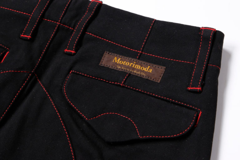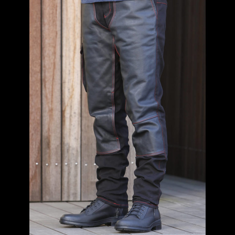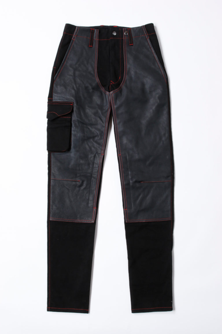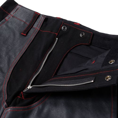 ブラックを基調としたレザーパンツにレッドのステッチの組み合わせは、今までのマックスフリッツにはないコラボレーションらしい一着。