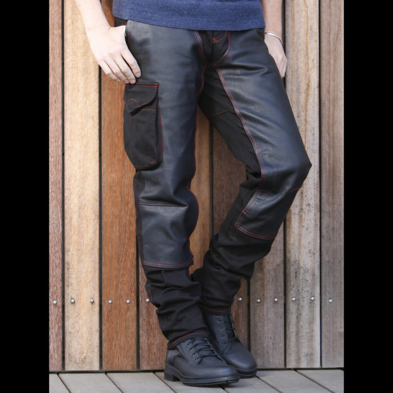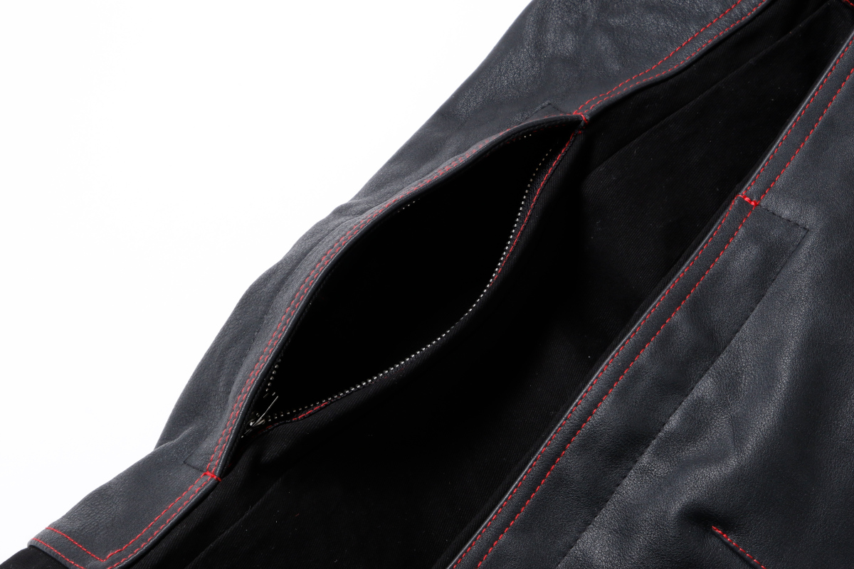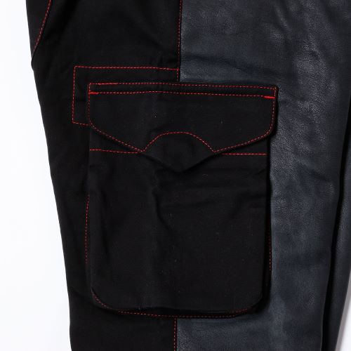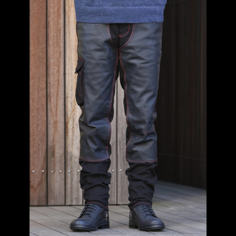 デザインは、ネーミングでもわかるように左右非対称に右側面のみに付けられたマチ有りカーゴポケットはレッグバッグ的機能と、従来のカーゴパンツにはないミニマムでシンプルなデザインに仕上がっております。ライディング時に直接風を受けるフロント部分には、ワンウォッシュ&ウォッシャブルのしなやかなレザーを配し、コットンとレザーの切り返しによる、同色異素材の着こなしが楽しめます。