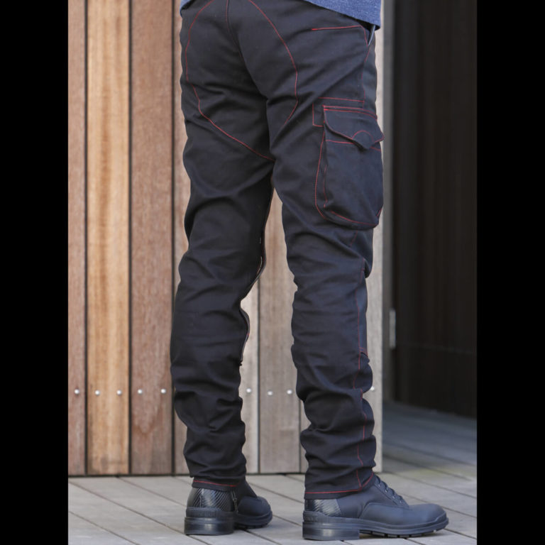 膝部分にはニープロテクターを装着できるポケットを装備。サイドから装着できるデザインになっており、普段着使いを損なわないシンプルなデザインながら、しっかりと安全面も考慮しています。