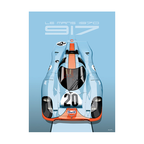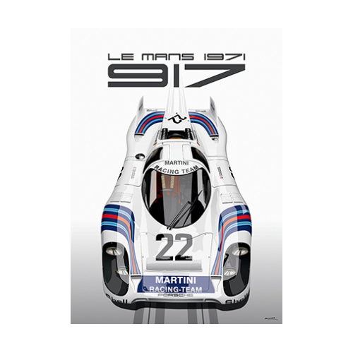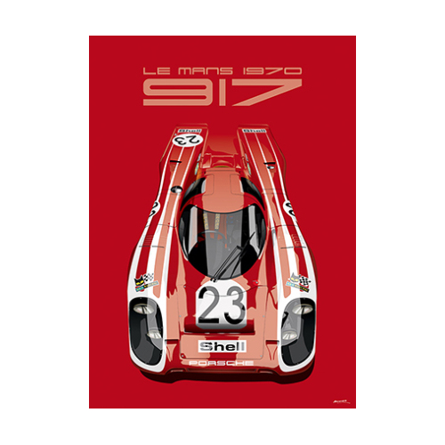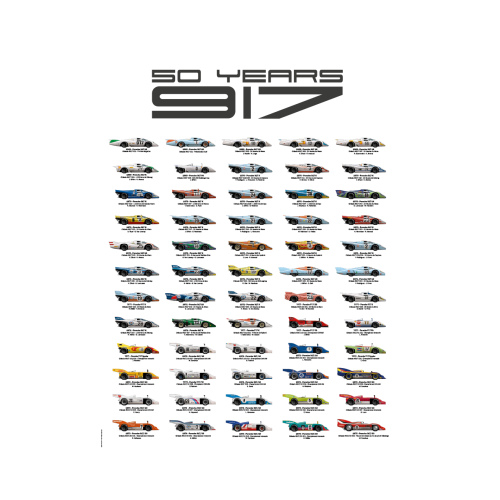 1969年に登場したポルシェ917の歴代のマシンが並んだポスター。917K、917LH、917/20をはじめ、北米に戦いの場を移したCanAM仕様までが勢ぞろい。